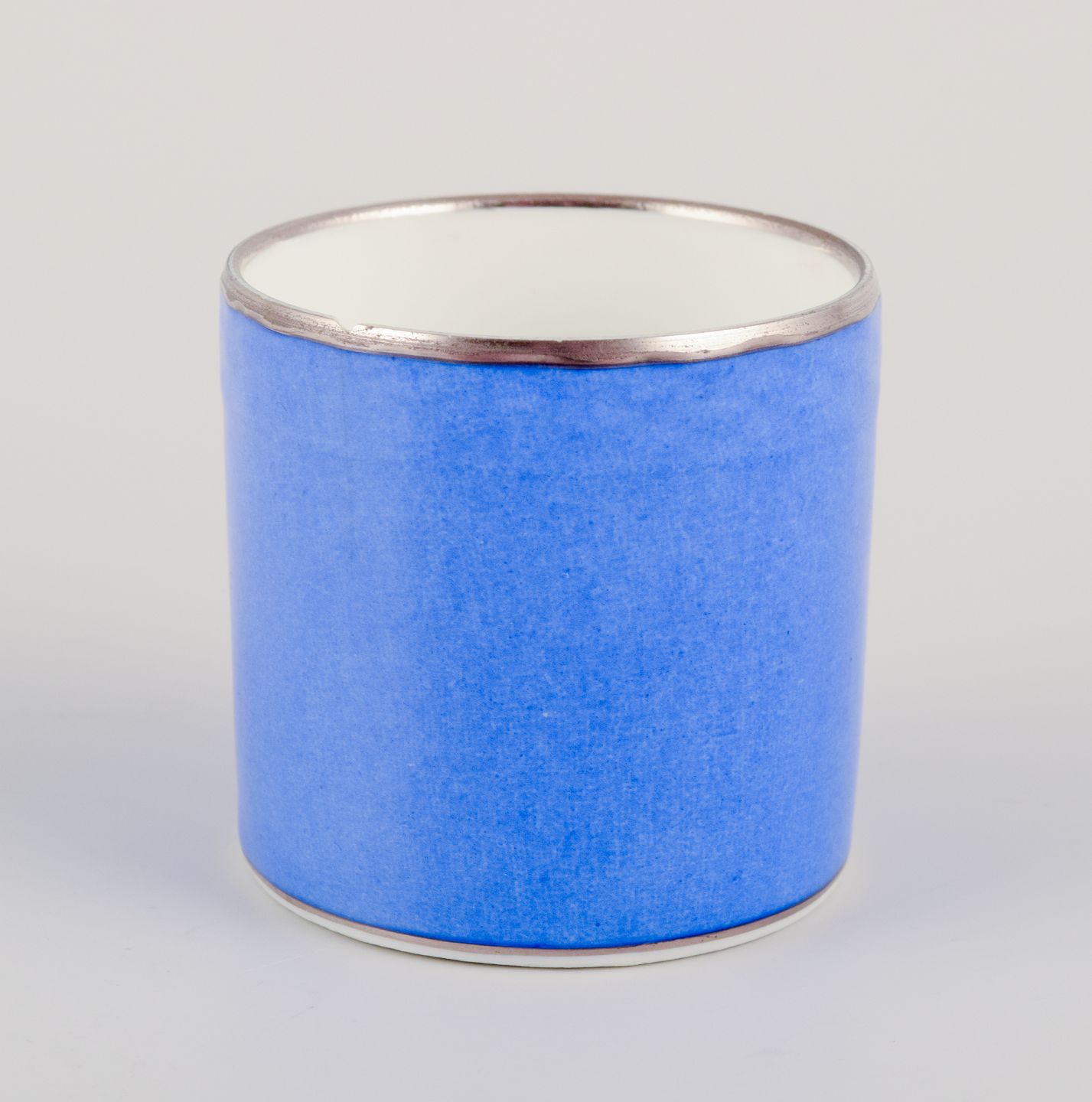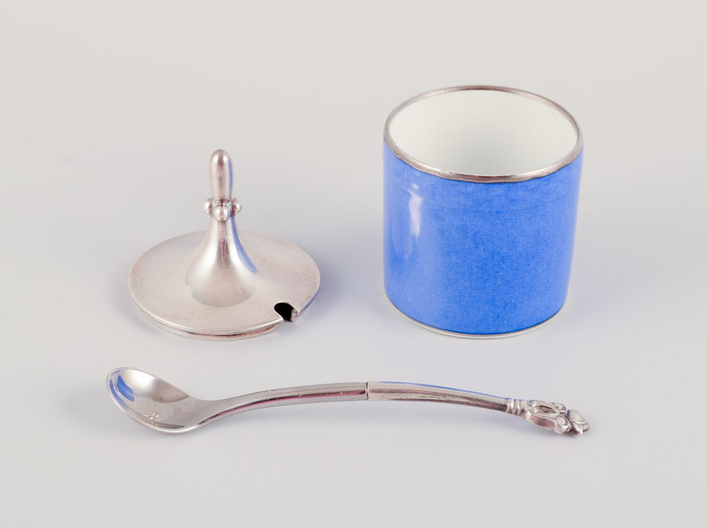 Porcelain mustard jar with matching lid and spoon in sterling silver.