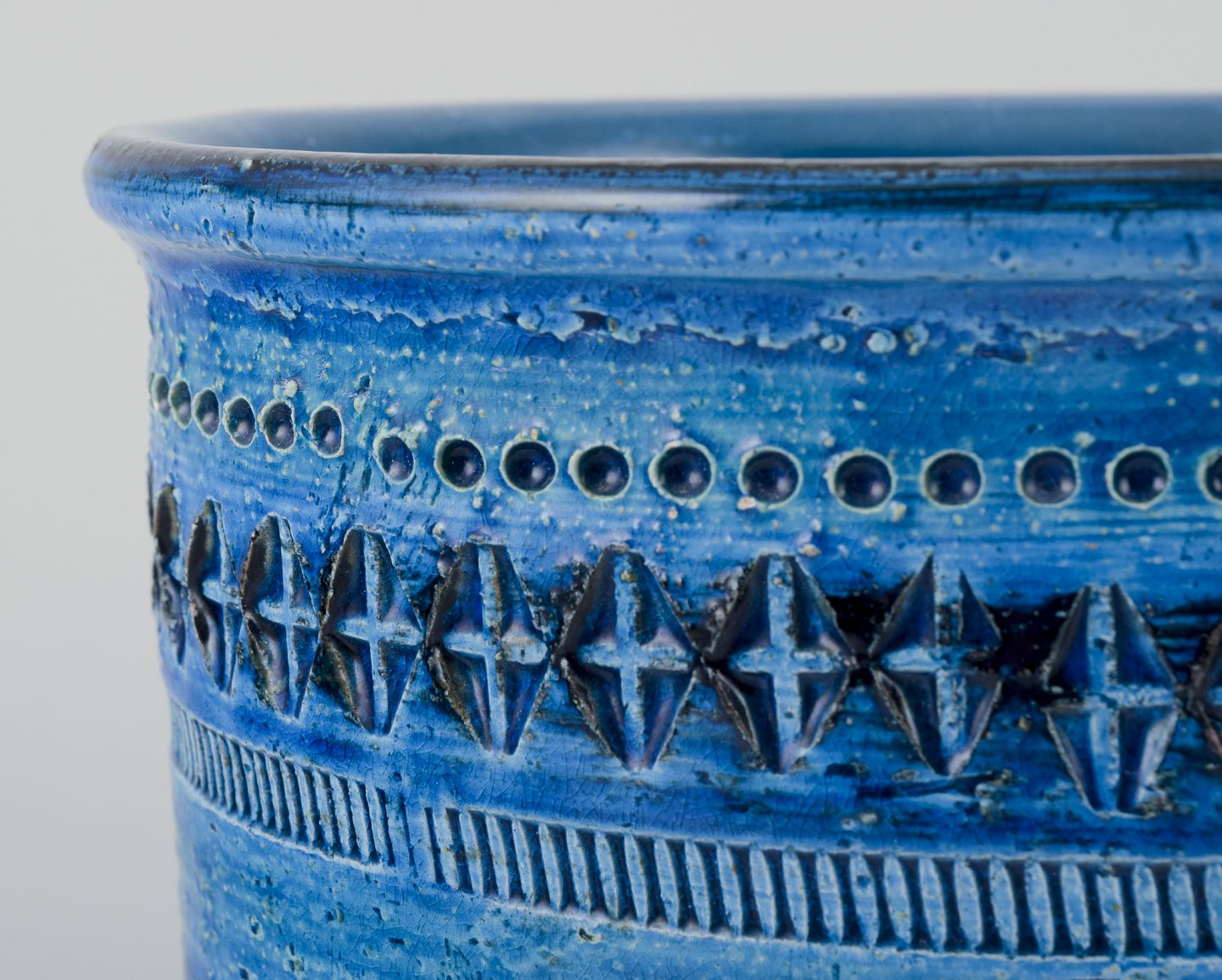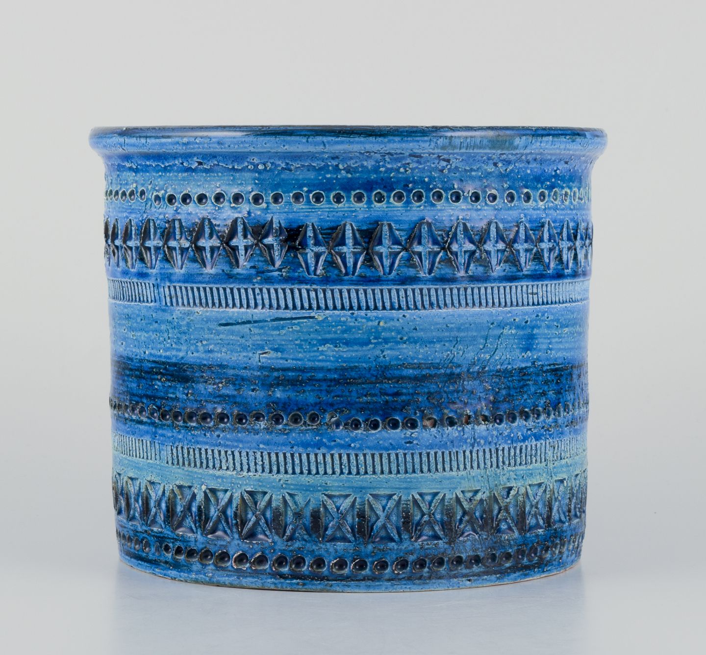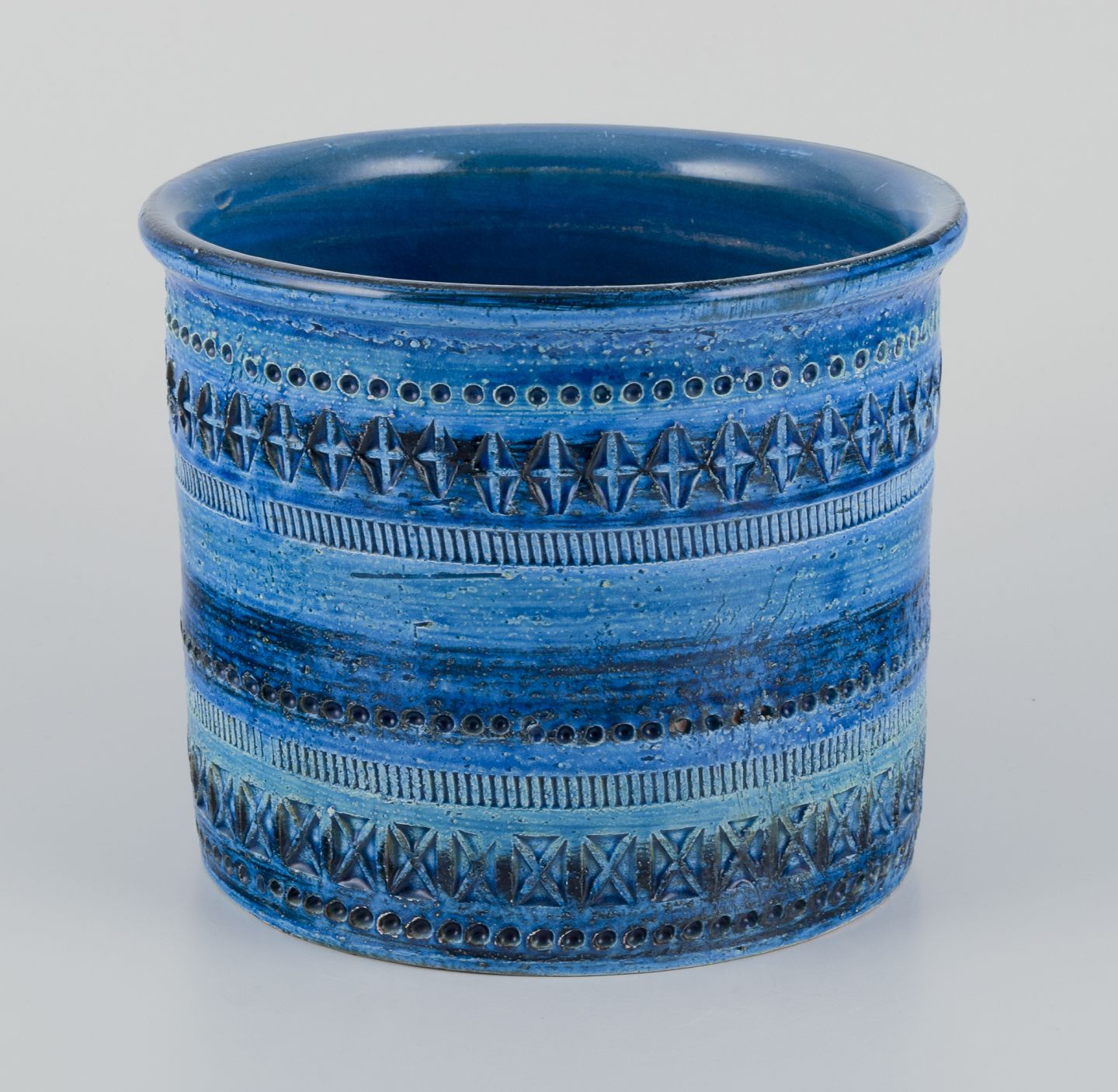 Aldo Londi for Bitossi. Stor urtepotteskjuler i Rimini-blå glaseret keramik med geometriske mønstre.