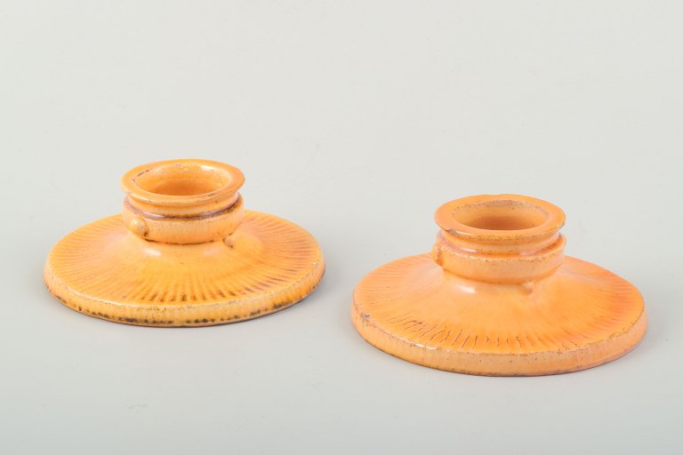 Two low, round ceramic candlesticks with broad bases and shallow holders. Glazed in a vivid orange uranium glaze with finely incised decoration forming a sunburst-like pattern. Both candlesticks signed underneath with HAK (Herman A. Kähler)