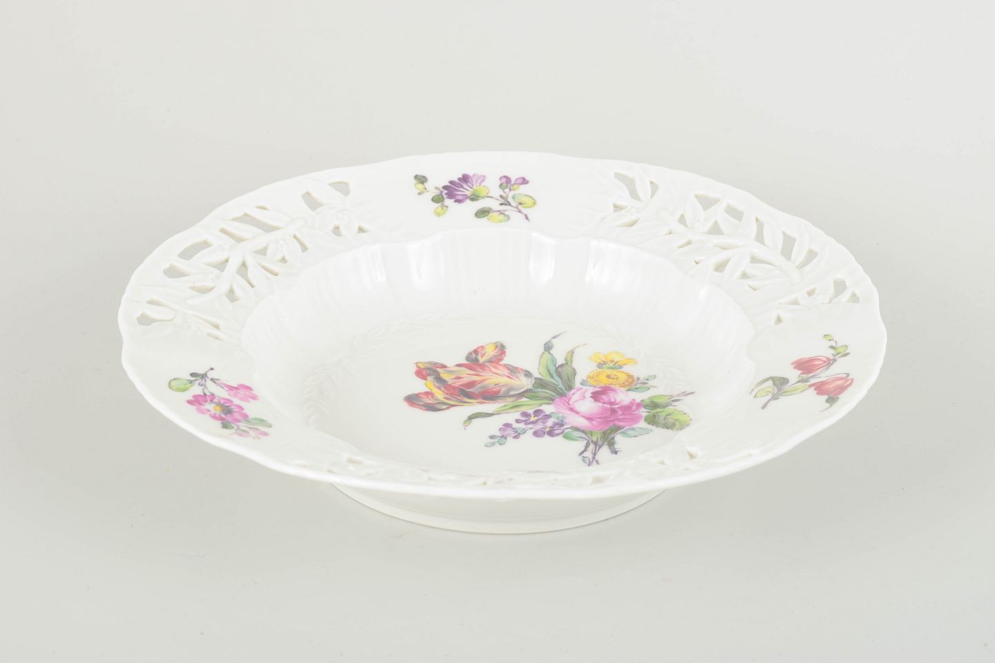 Håndmalet porcelæn med blomstermotiv i flerfarvet palet og gennembrudt bort i klassisk stil. Elegant dyb form med rigt dekoreret spejl og raffineret håndværksdetalje.