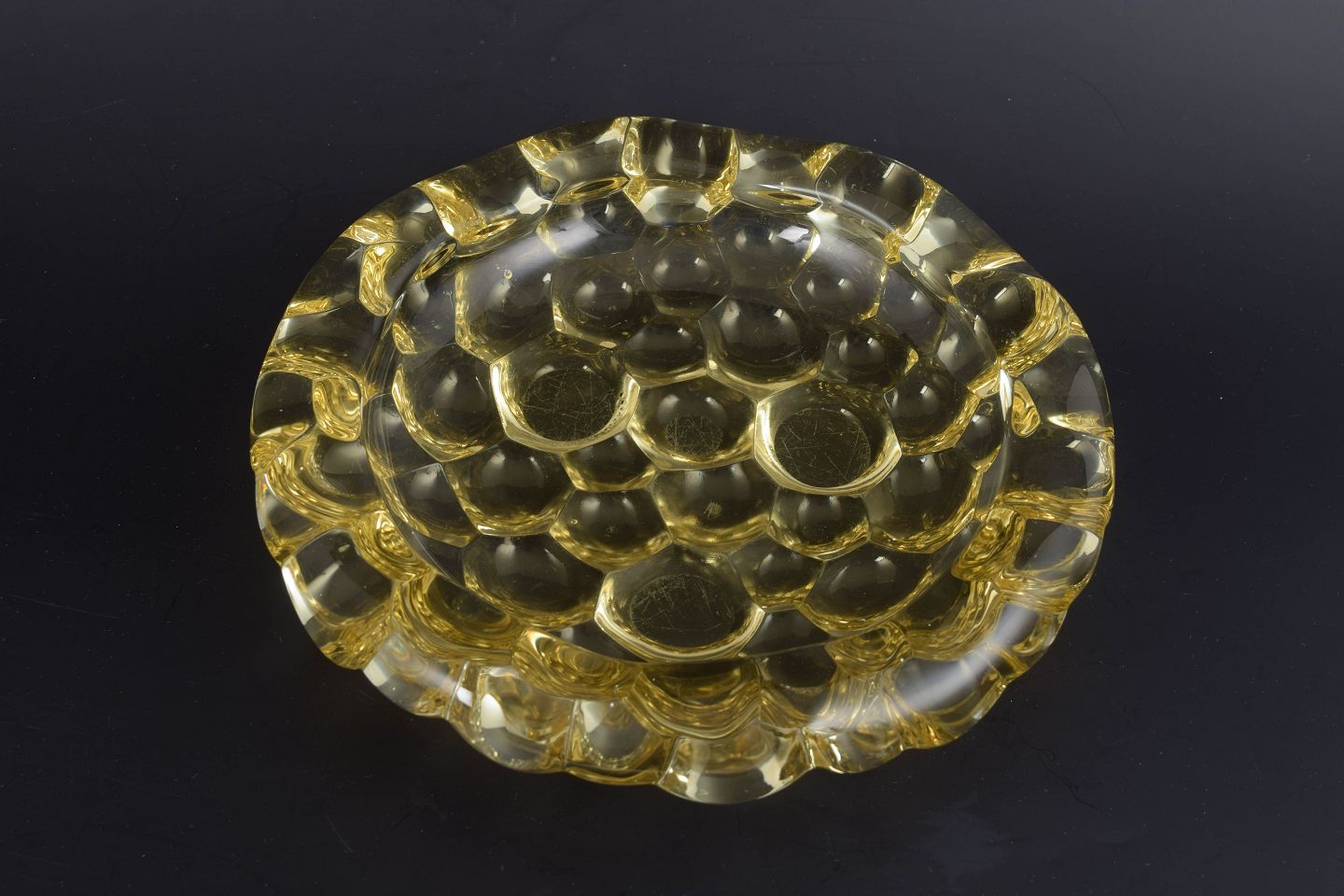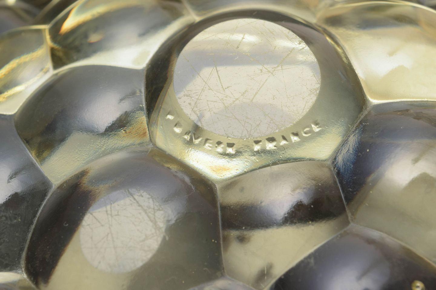 Rare yellow pressed-glass bowl with characteristic Art Deco ornamentation and organic, undulating rim. Pierre d’Avesn’s signature use of bold relief and geometric structure is clearly evident in this decorative and highly desirable example.