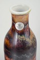 Slender baluster-shaped stoneware vase with a rich multicoloured glaze in deep brown, bluish and ochre tones, finished with a light rim at the mouth. Model referred to in the description.