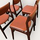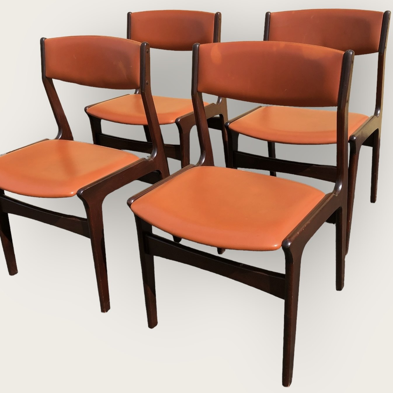 Four dark stained dining table chairs from Nova furniture with brown leather upholstery. Design Erik Buch, Appears in nice used condition.