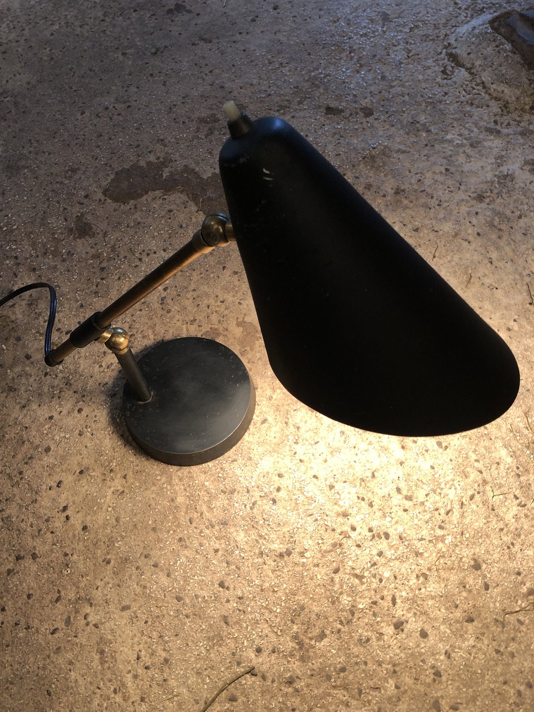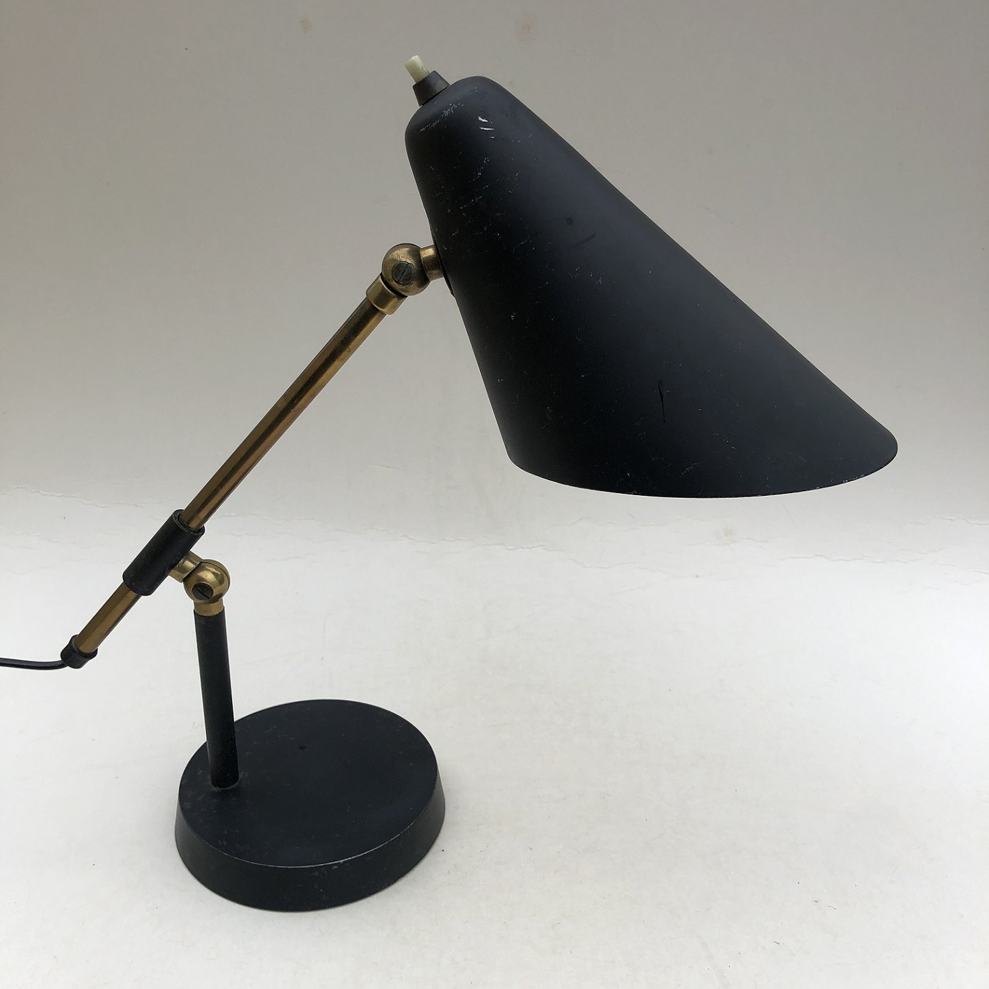 Office lamp in black metal and brass, fully functional but somewhat patinated on both the lampshade and base (see photo). Denmark 1950-1960s, Height approx. 35 cm, width approx. 28 cm.