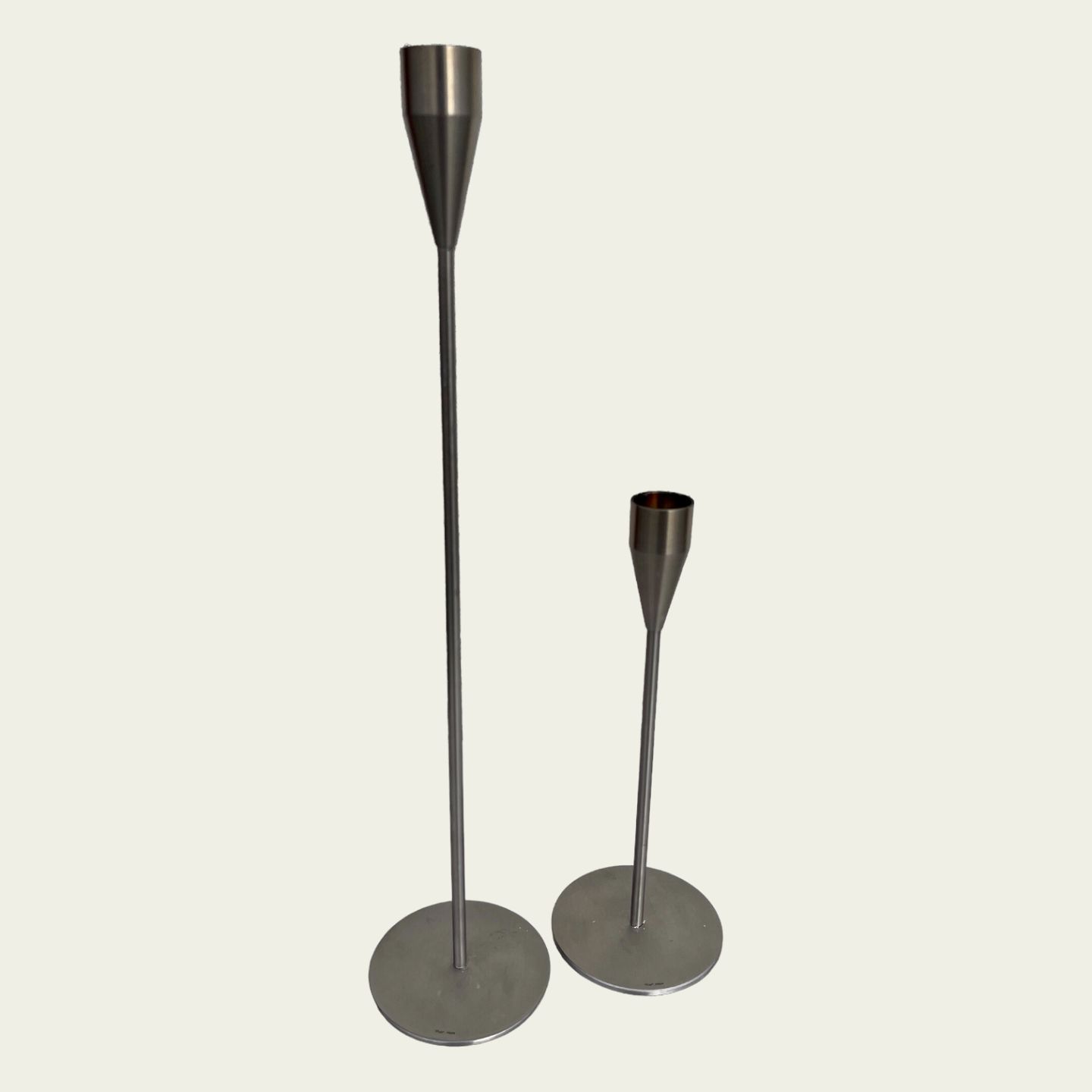 Piet Hein, Venus, Kerzenständer-Set mit 2 Kerzenständern, Gebürsteter Stahl, 36,5 cm hoch, 21 cm hoch, 8 cm Durchmesser, Design Piet Hein "Tomorrow is today last - Light a candle for all new years" *Guter gebrauchter Zustand*