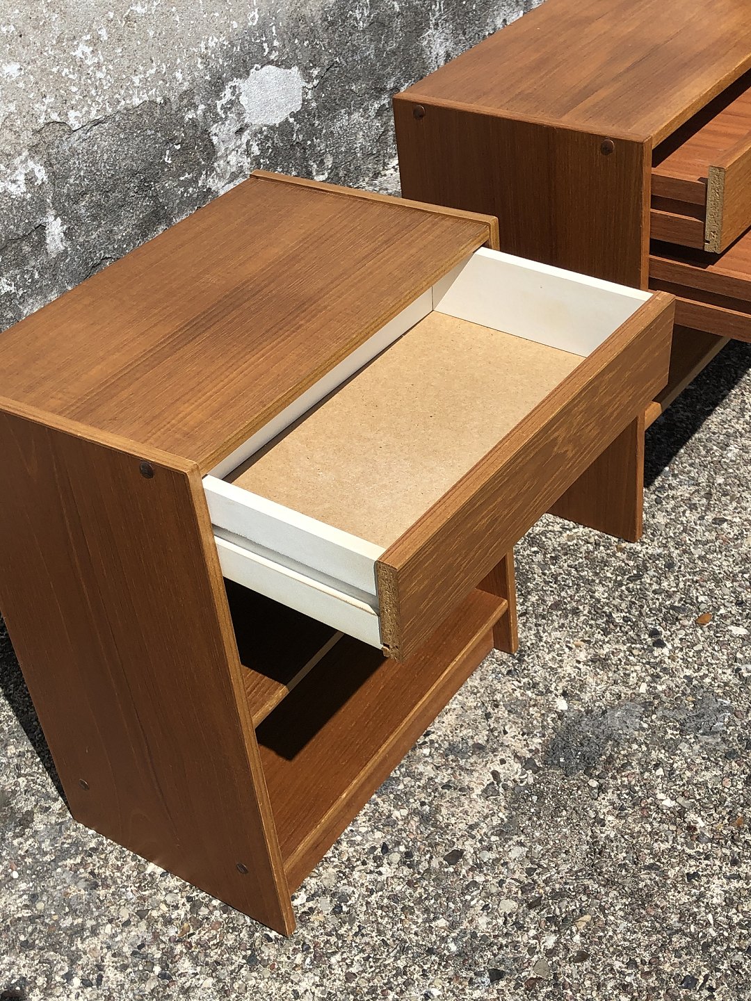 Sengeborde i teakfiner med skuffe. Danish modern fra 1970'erne. Mål største HxBxD 50x52x30 cm, mindste: 51x41x27 cm.