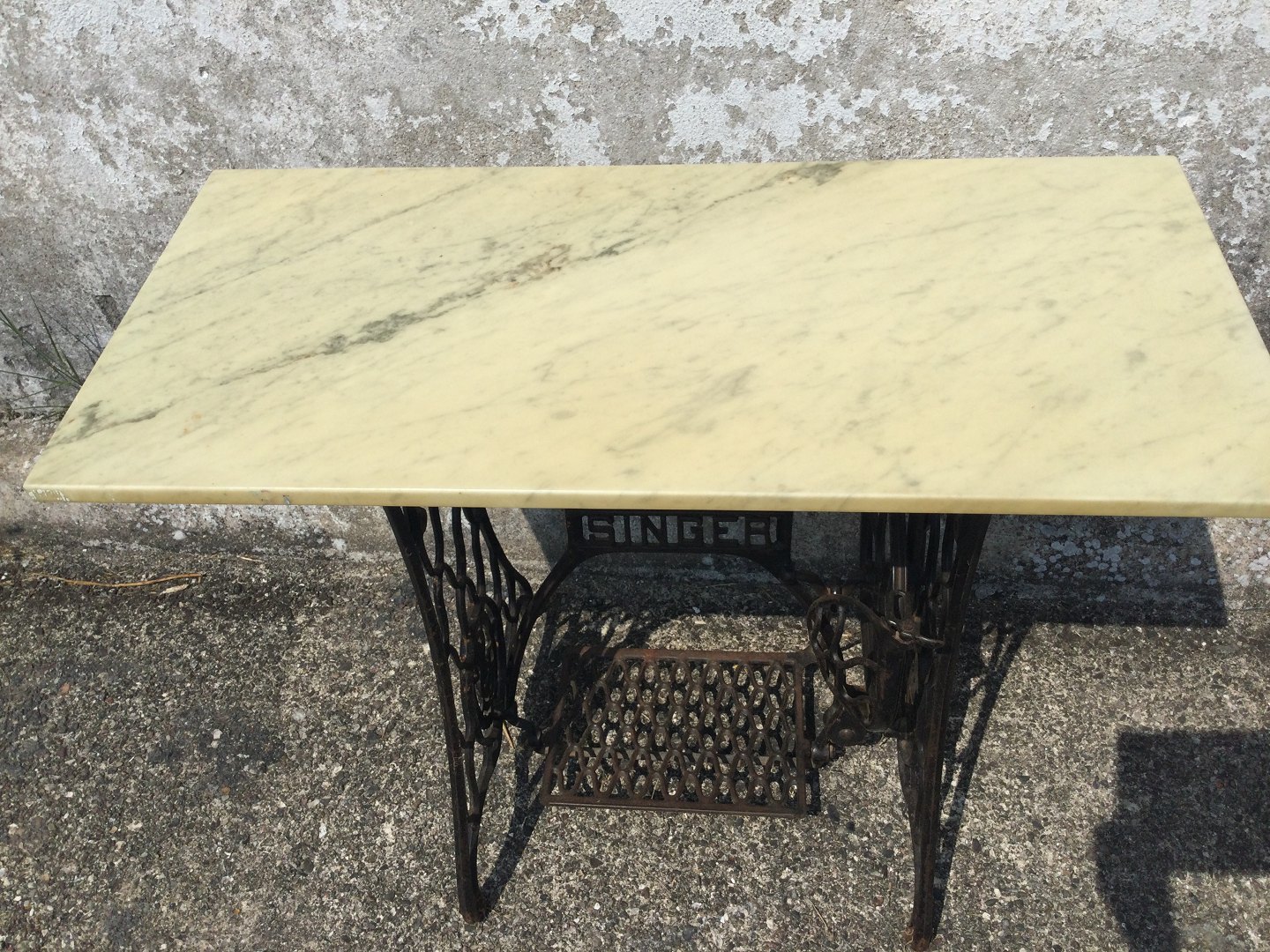 Sewing machine table in metal with later marble top. Dimensions: HxWxD 74x95x45 cm