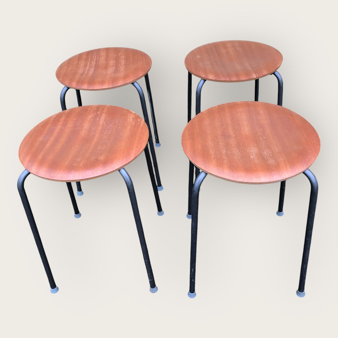 Skammel / Taburet med sæde i teakfiner og 4 ben i stål, Mærket: Made in Denmark, Danish modern fra 1960'erne, Højde 45cm, diameter 32,5 cm, fremstår i pæn stand med få brugsspor.