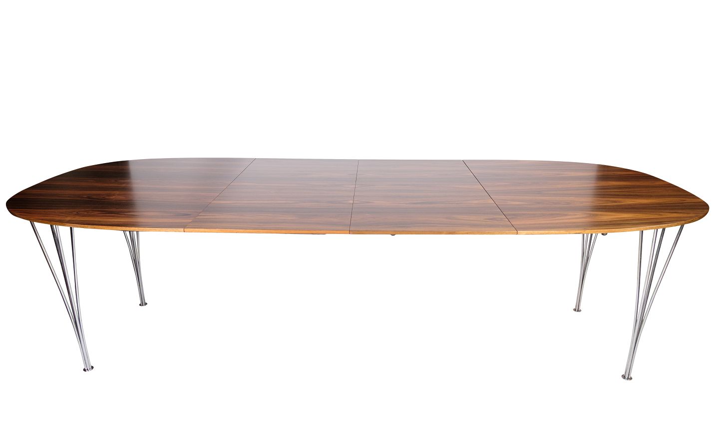 SoldDining table, designed by Piet Hein & Bruno Mathsson with rosewood veneer and steel legs produced by Fritz Hansen. The table is from the 1960s and is in incredibly nice condition.