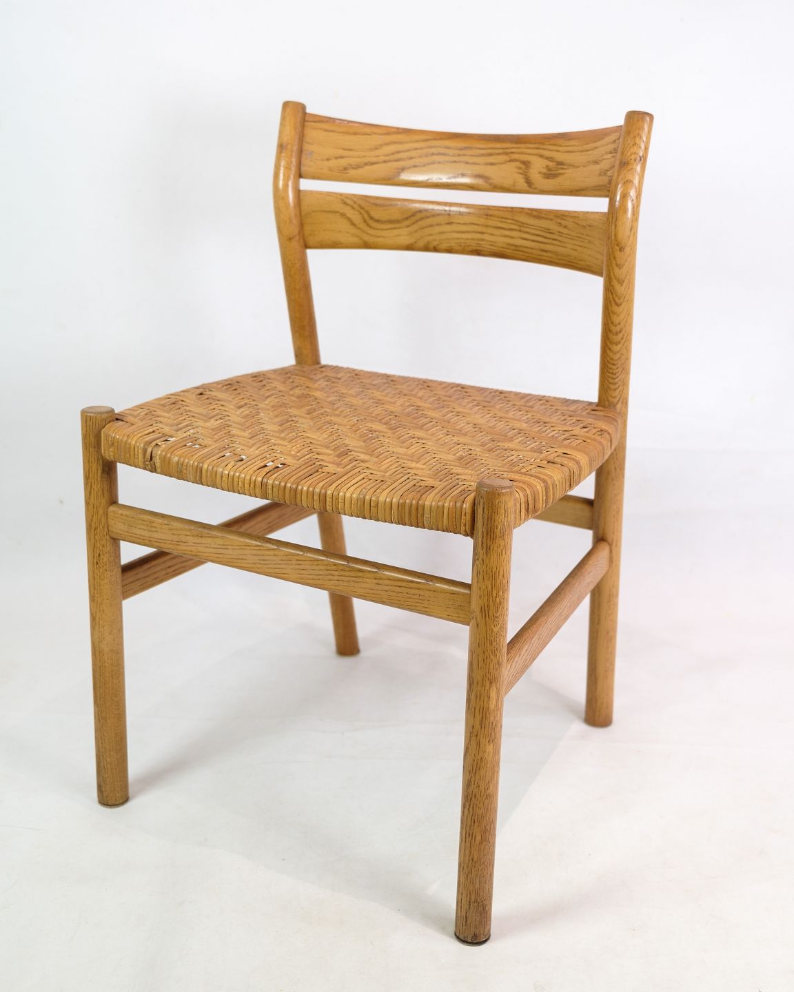 SoldSet of four dining chairs in oak and seat in wicker, designed by Børge Mogensen and produced by C.M Madsen Møbelfabrik in the 1960s. The chairs are in nice vintage condition. Their simple and timeless design makes them suitable for a range of interior styles and will fit into any dining room environment
