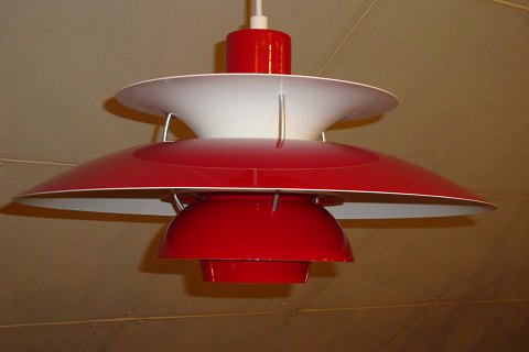 Poul Henningsen loftlampe PH5 i flot rød højglans. Lampen fremstår i perfekt stand og er en udstillingsmodel, sælges med certifikat.