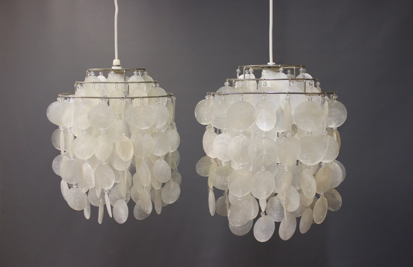 Et par FUN pendler designet af Verner Panton i 1955 og fremstillet hos Verpan. Pendlerne er med skaller af Perlemor.