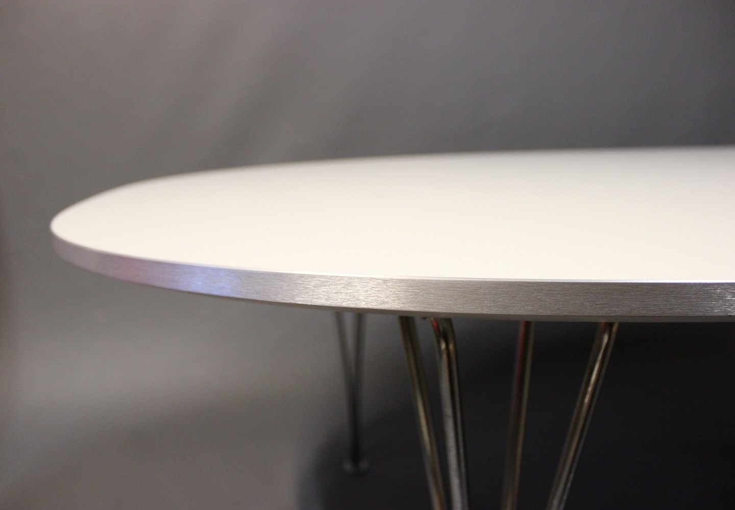 Superellipse Piet Hein sofabord designet af Arne Jacobsen, Piet Hein og Bruno Mathsson og fremstillet af Fritz Hansen. Bordet er med hvid laminat og aluminiumskant og en sjælden model.