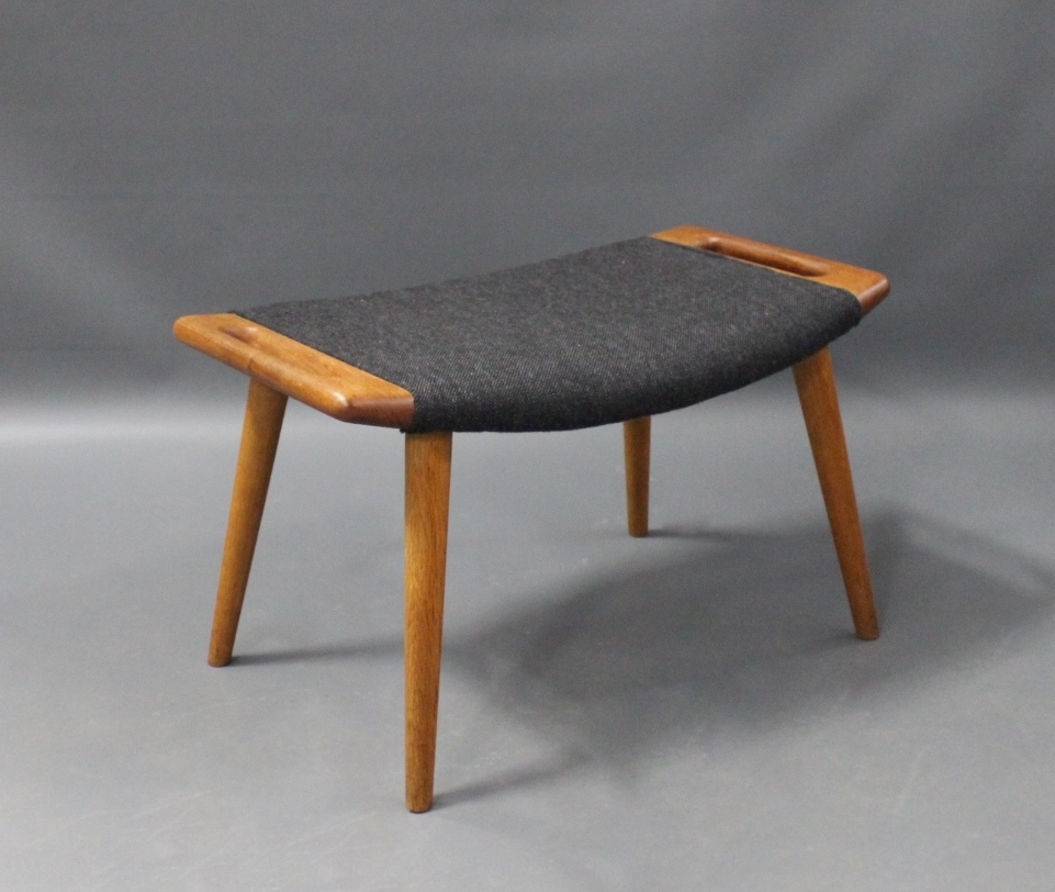 Stool for the Papa Bear chair, model PP120, designed by Hans J. Wegner in 1954 and manufactured by P.P. Furniture. The stool is upholstered in dark grey Hallingdal wool and with legs of Teak.