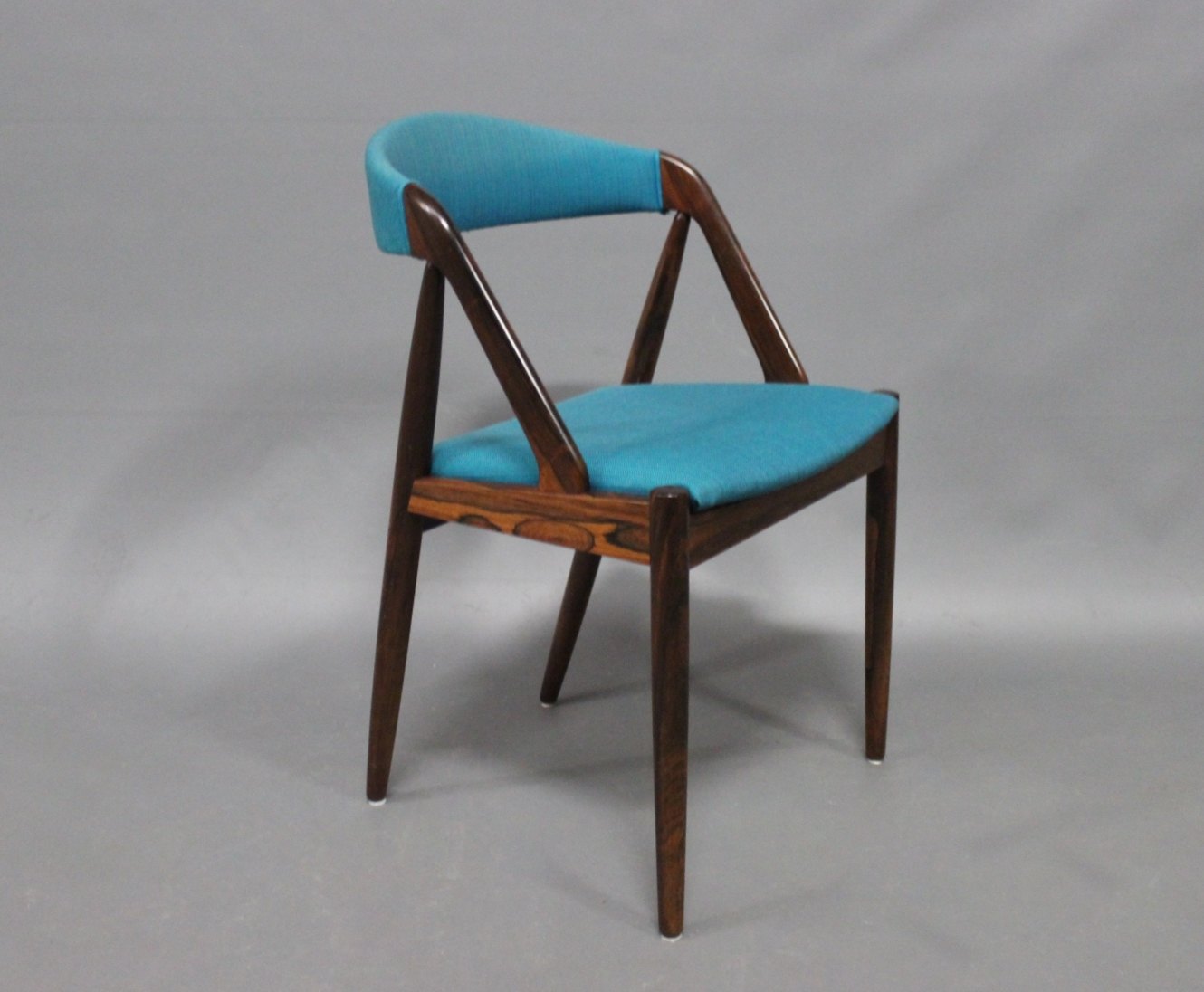 SoldA set of six dining room chairs, model 31, designed by Kai Kristiansen in 1956 and manufactured by Schou Andersen in the 1960s. The chairs are in rosewood and upholstered in blue fabric.