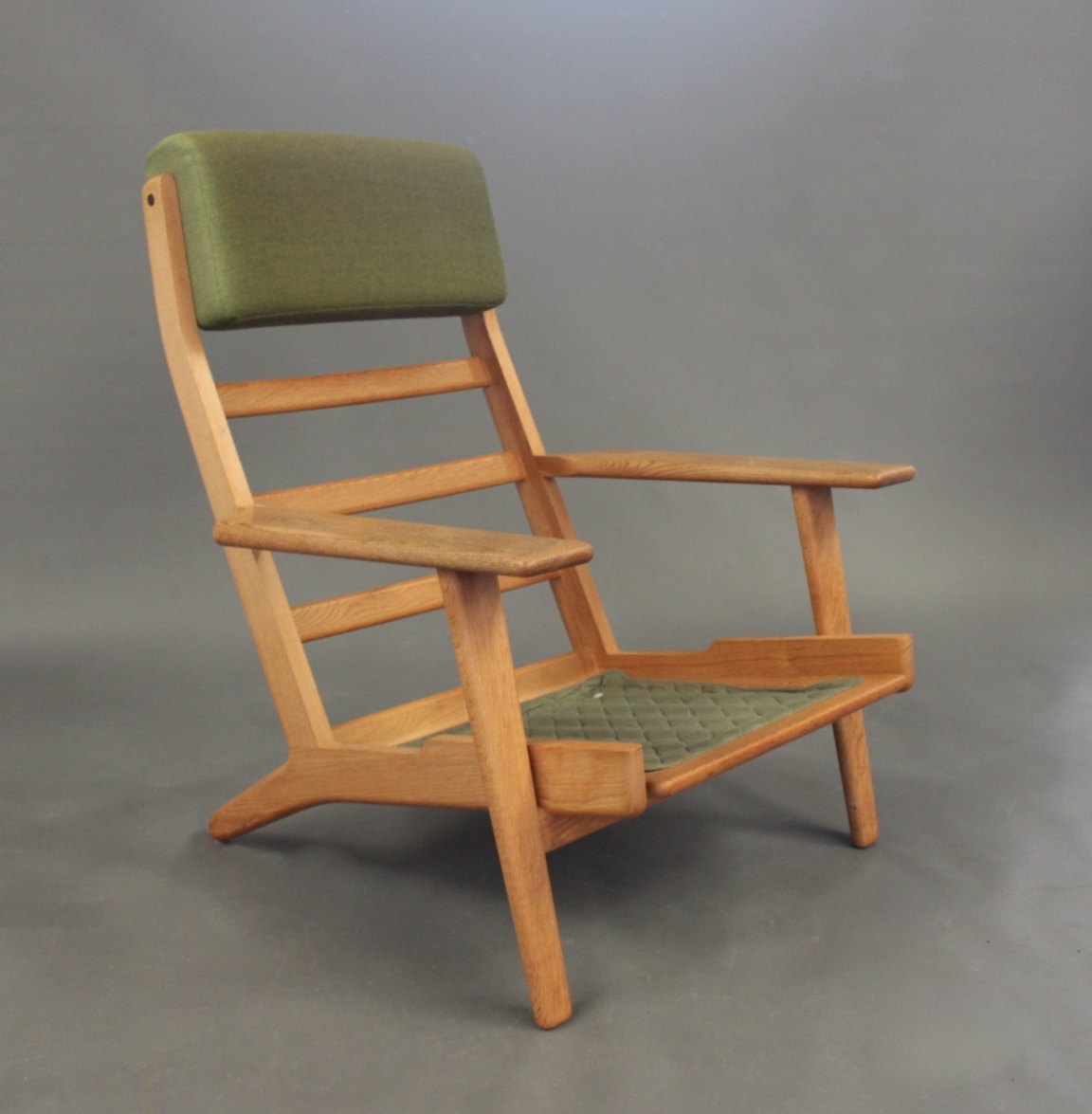 SoldA pair of armchairs with high backs, model GE290A, designed by Hans J. Wegner in the 1950s and manufactured by GETAMA in the 1960s. The chairs are made of oak and the cushions are of dark green upholstery. We have 1 left.