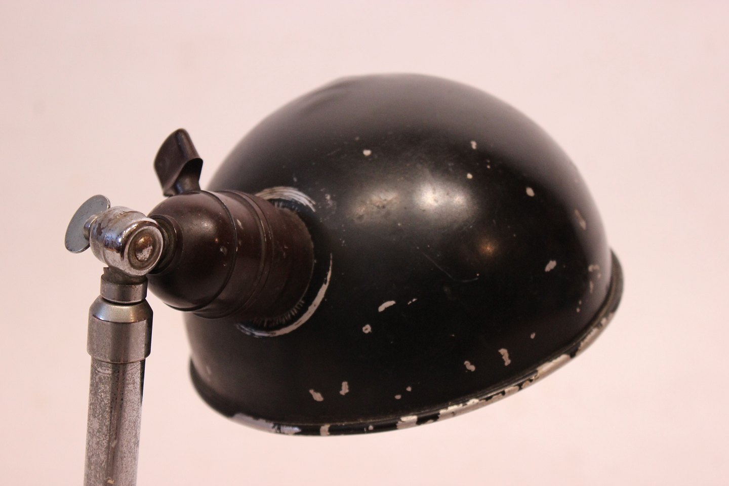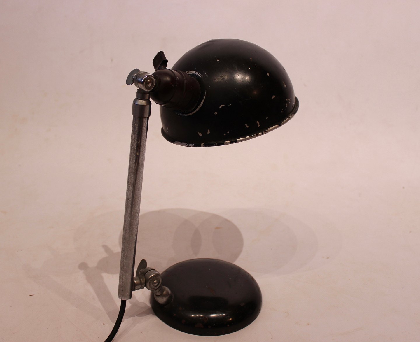 SolgtKontor- og/eller arbejdslampe af sort malet metal, justerbar og fra 1940erne. Lampen er i fin brugt stand.