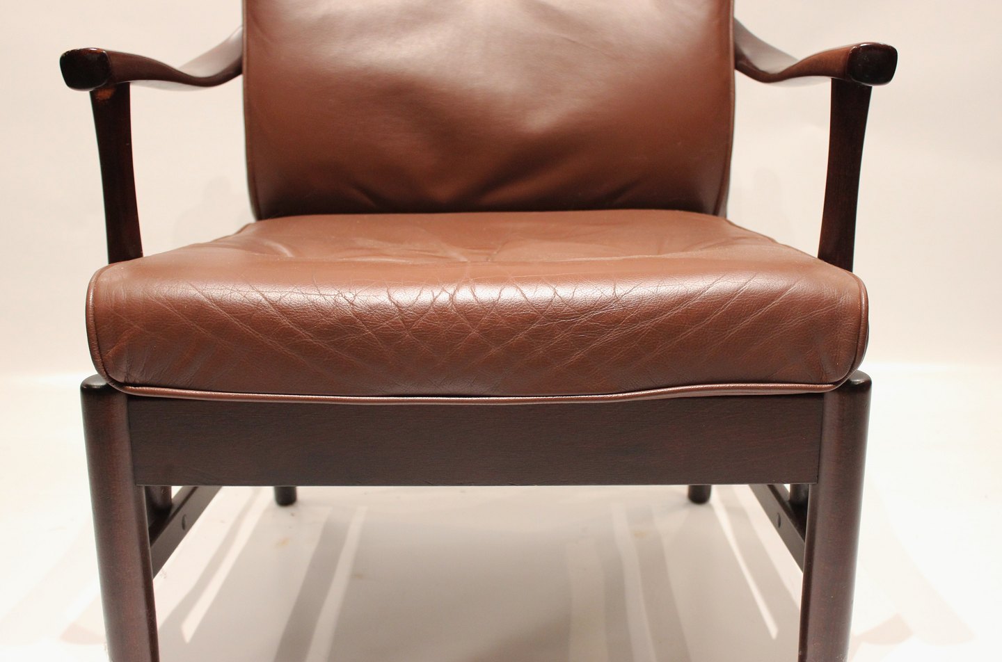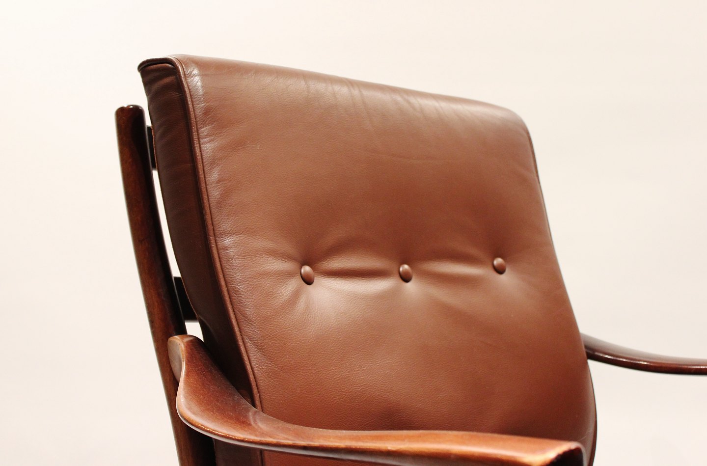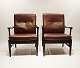 Et sæt lænestole af poleret træ og mørkebrunt læder, dansk design fra 1960erne.