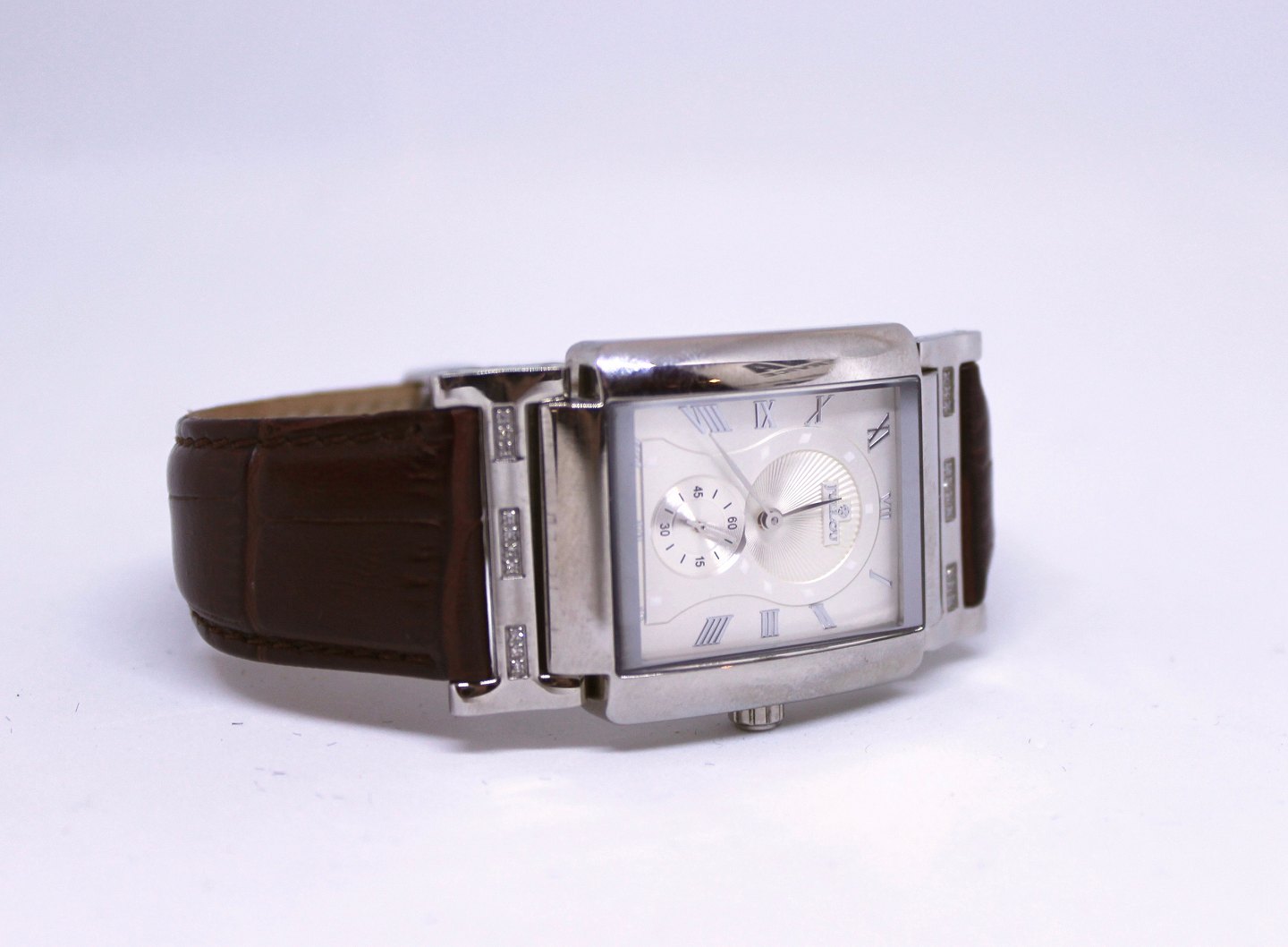Jullou men's wrist watch with swiss quartz, case of stainless steel with 20 diamonds and with brown leather strap. The watch is in great vintage condition.