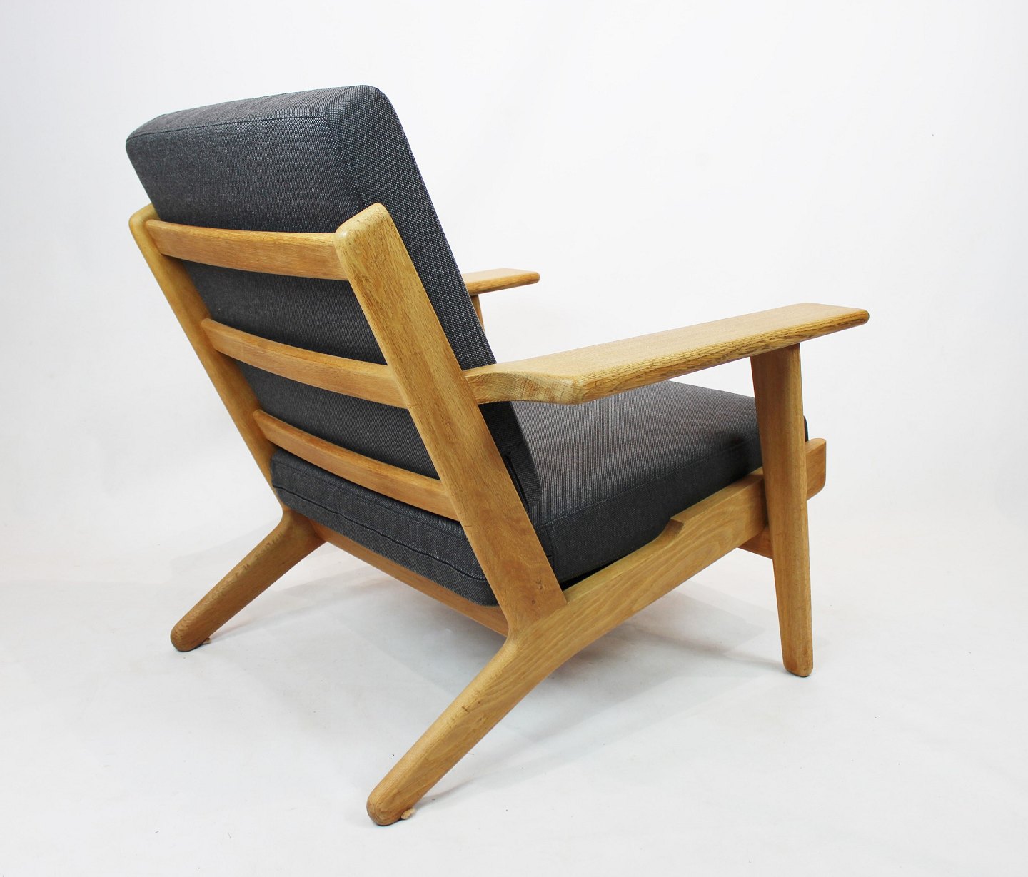 Armstol, model GE290, designet af Hans J. Wegner i 1950erne og fremstillet hos GETAMA i 1960erne. Stolen er af eg og hynder nypolstret af mørkegråt uldstof.
