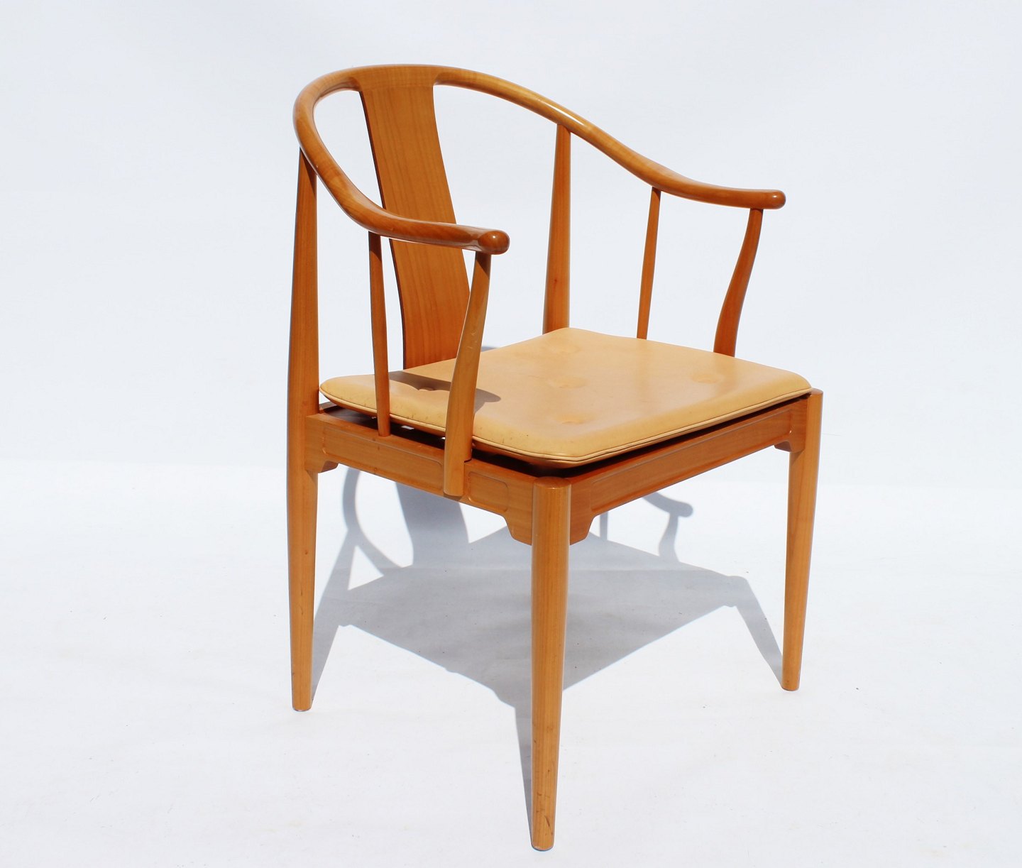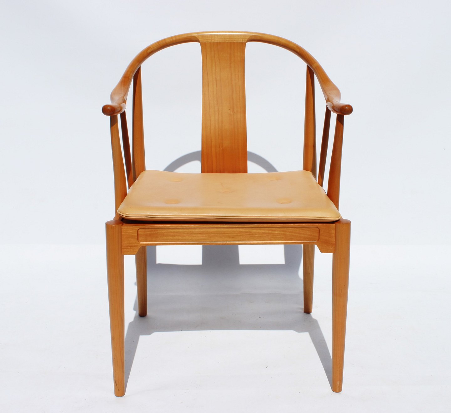 SoldA set of four China chairs, model 4283, designed by Hans J. Wegner in 1944 and manufactured by Fritz Hansen in 1999. The chairs are of cherry and with cushion of patinated leather. 2 chairs left.