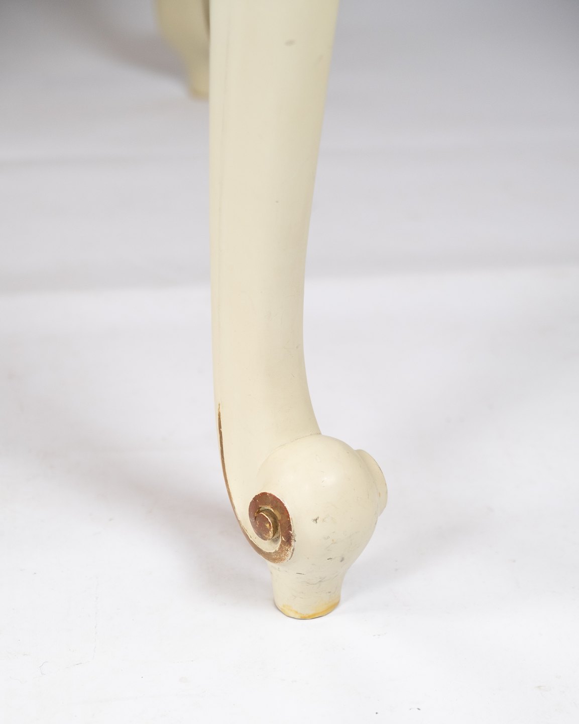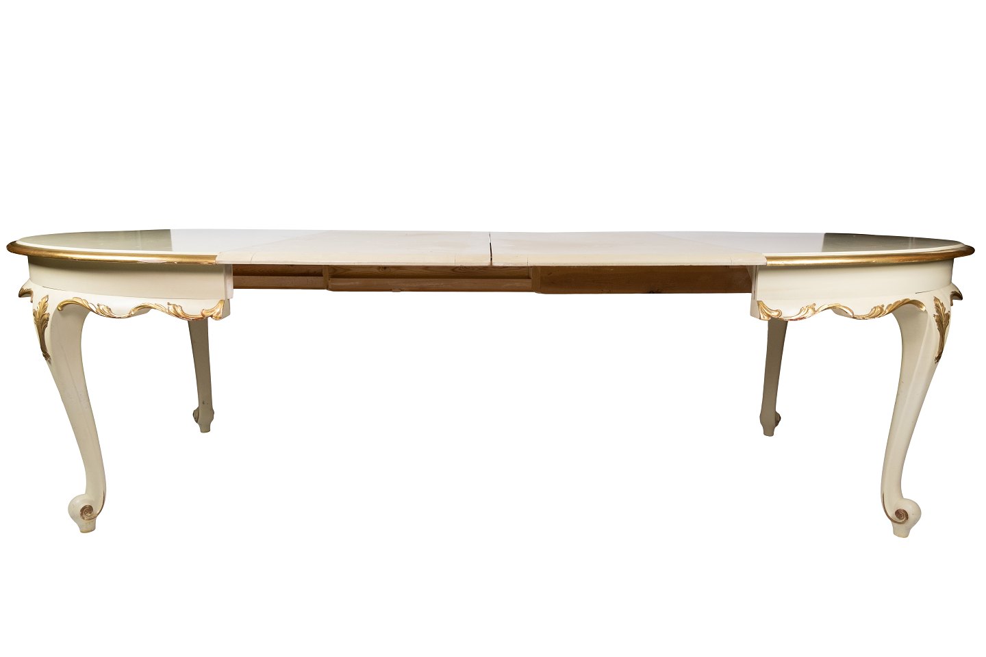 SolgtRokoko spisebord af hvid malet træ dekoreret med bladguld, og med tre udtræksplader fra 1890erne. Bordet er i flot brugt stand.