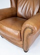 Stor hvilestole/øreklapstol i cognacfarvet læder. Stolen er i flot brugt stand.