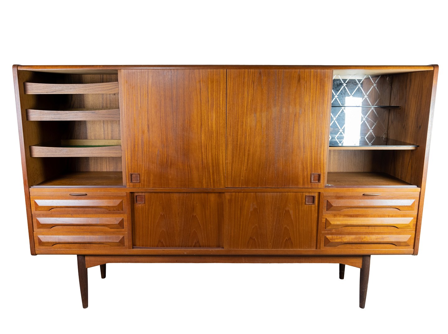 SolgtStort skab eller skænk i teak af dansk design fra 1960erne. Skabet er med skydelåger og diverse opbevaring.