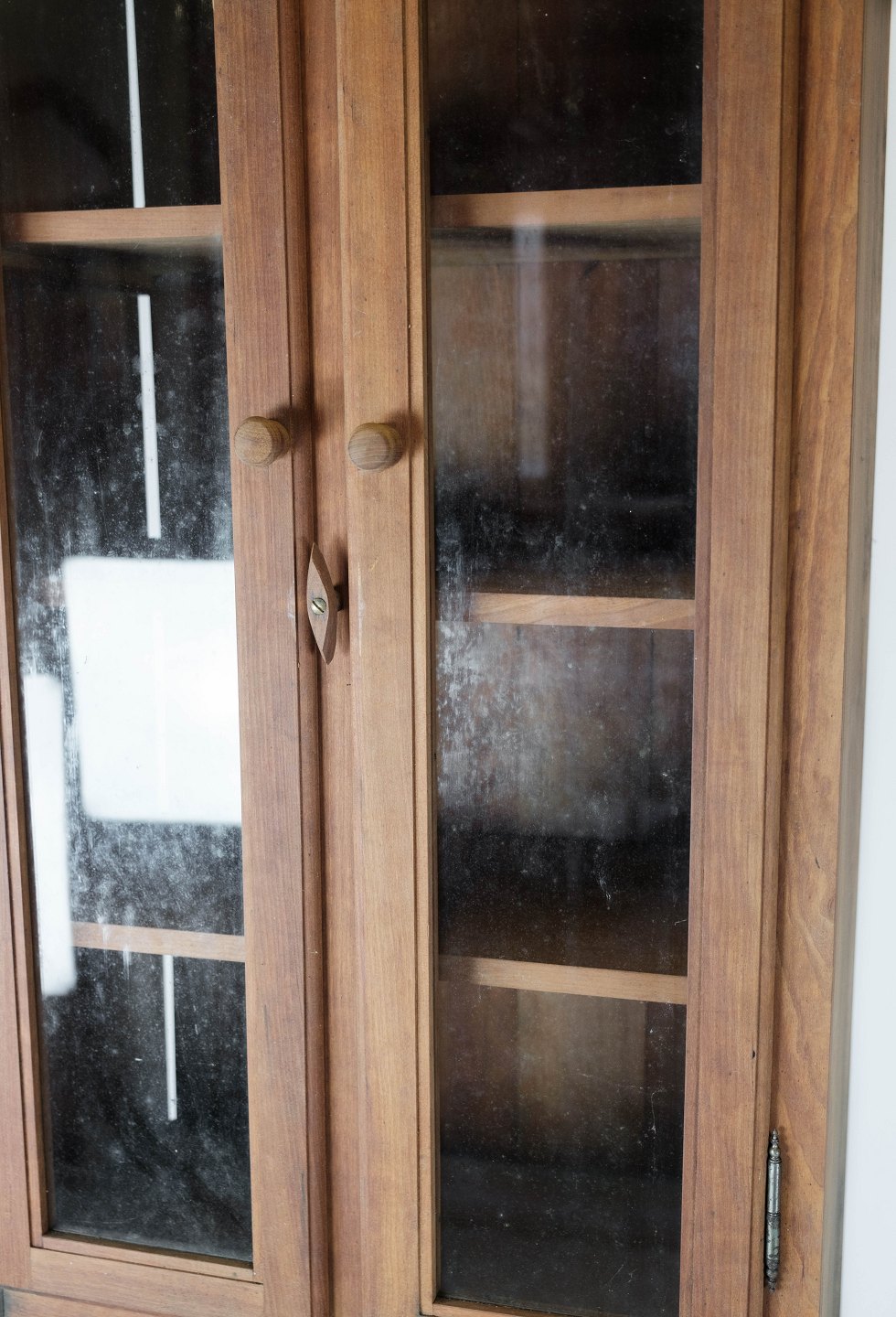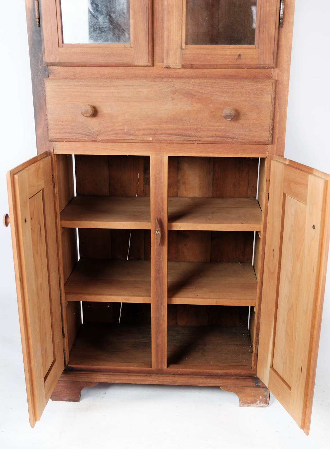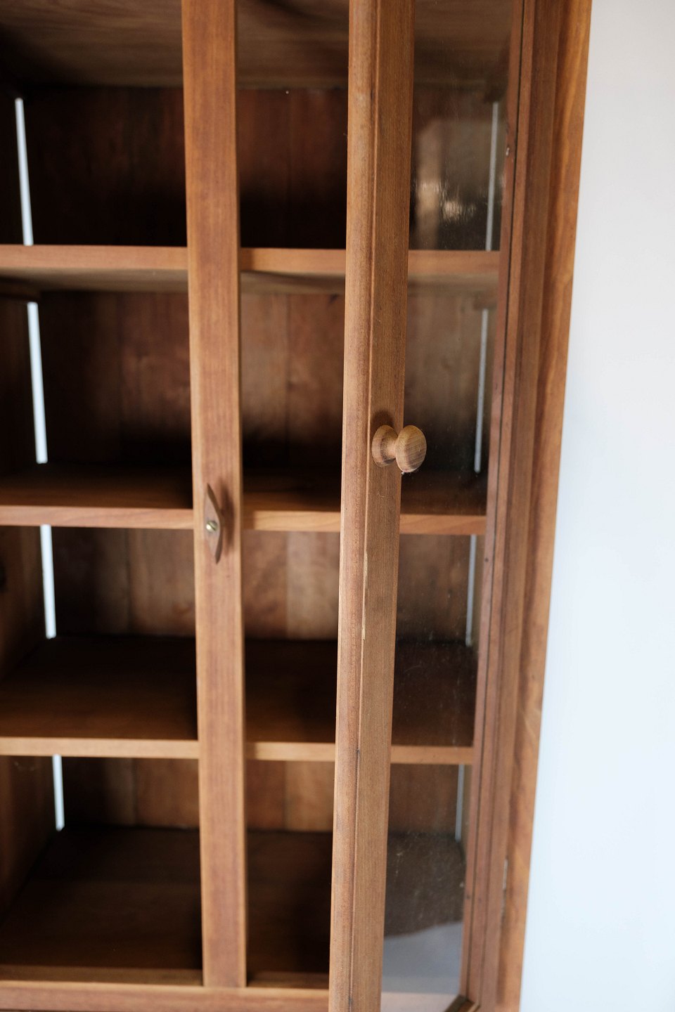 Tall glass cabinet of light wood, in great antique condition from the 1940s.