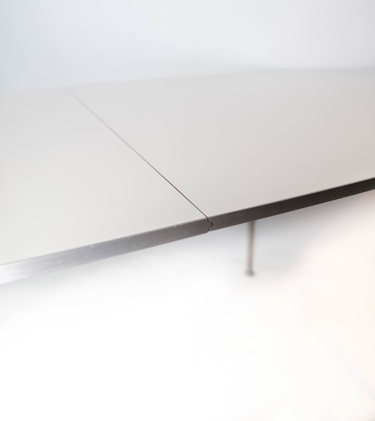 Super Ellipse dining table with white laminate designed by Piet Hein and Arne Jacobsen, and manufactured by Fritz Hansen in 2011. The table is in great vintage condition and with two extension plates.