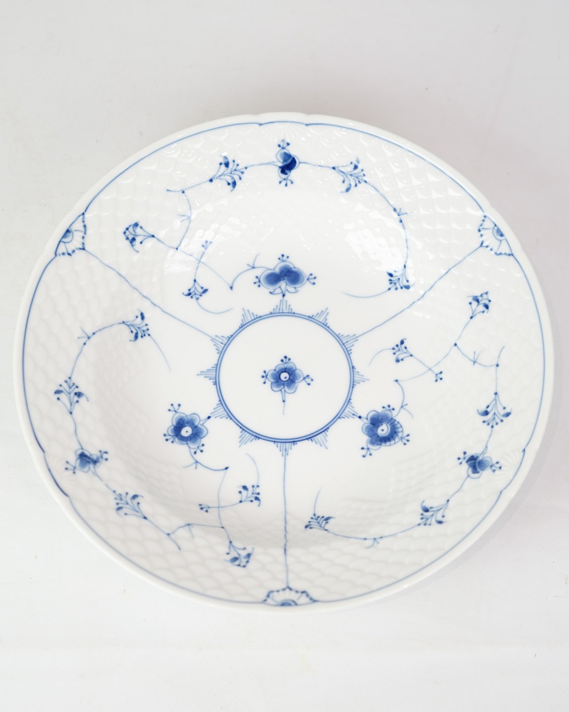Dyb Tallerken nr. 22 fra Bing & Grøndahl. Fremstillet af porcelæn med klassisk blåmalet musselmalet dekoration.