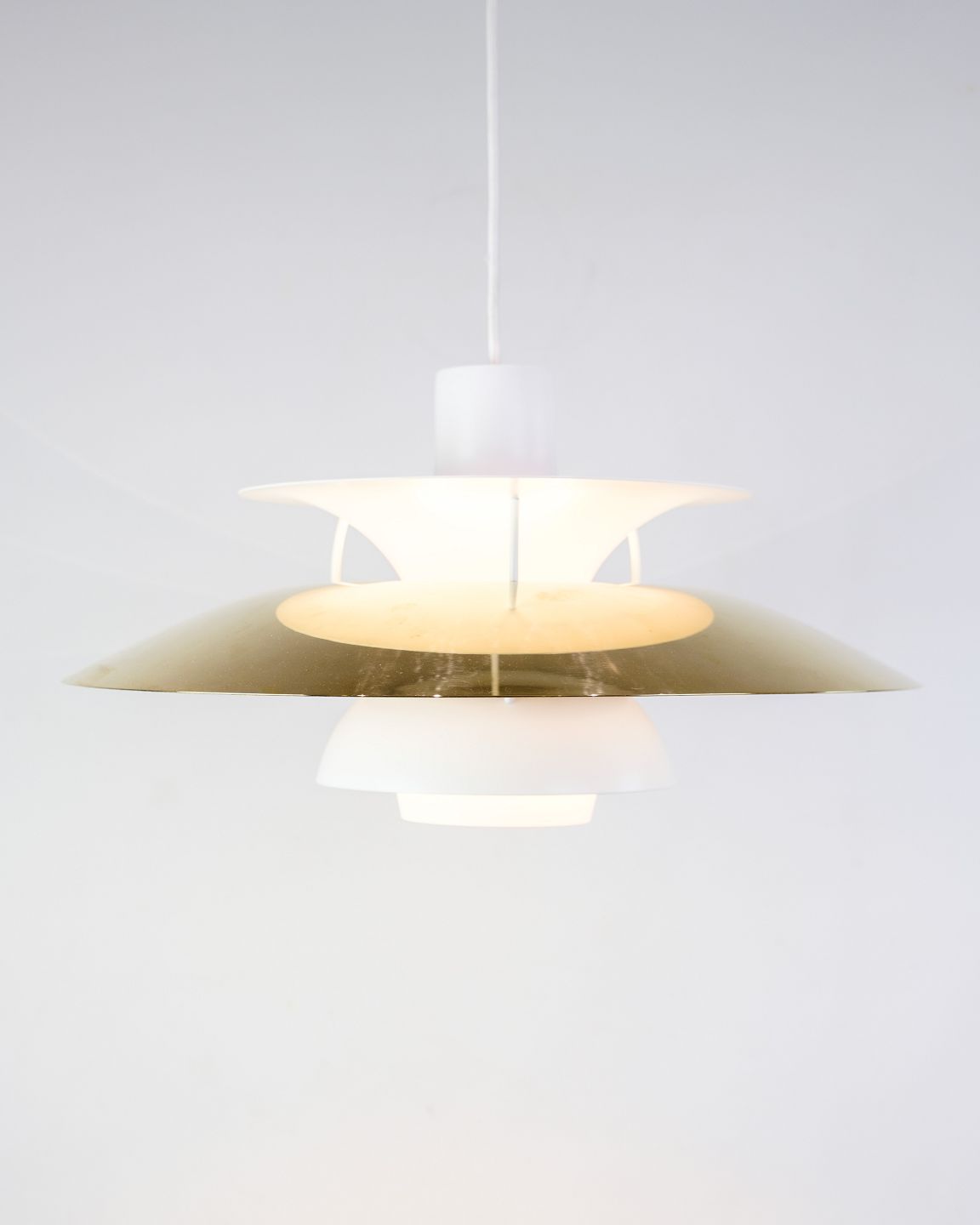Messing pendel, model PH5 fremstillet af Louis Poulsen og designet af Poul Henningsen i 1958. Designet er meget unikt på denne lampe, grundet af den udsender et blændfrit varmt lys, som er idealt over især spisebordet. Lampen bliver efterset på vores værksted inden levering. Vi har flere på lager så spørg efter lagerantal, hvis ønsket.