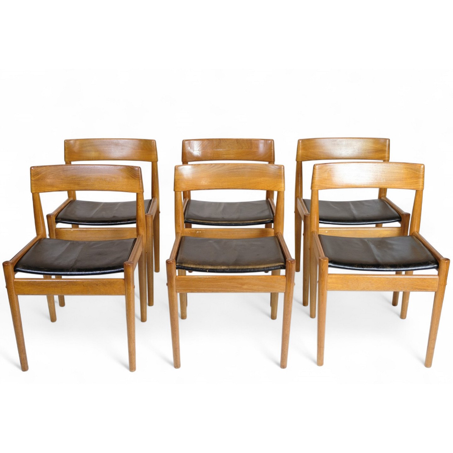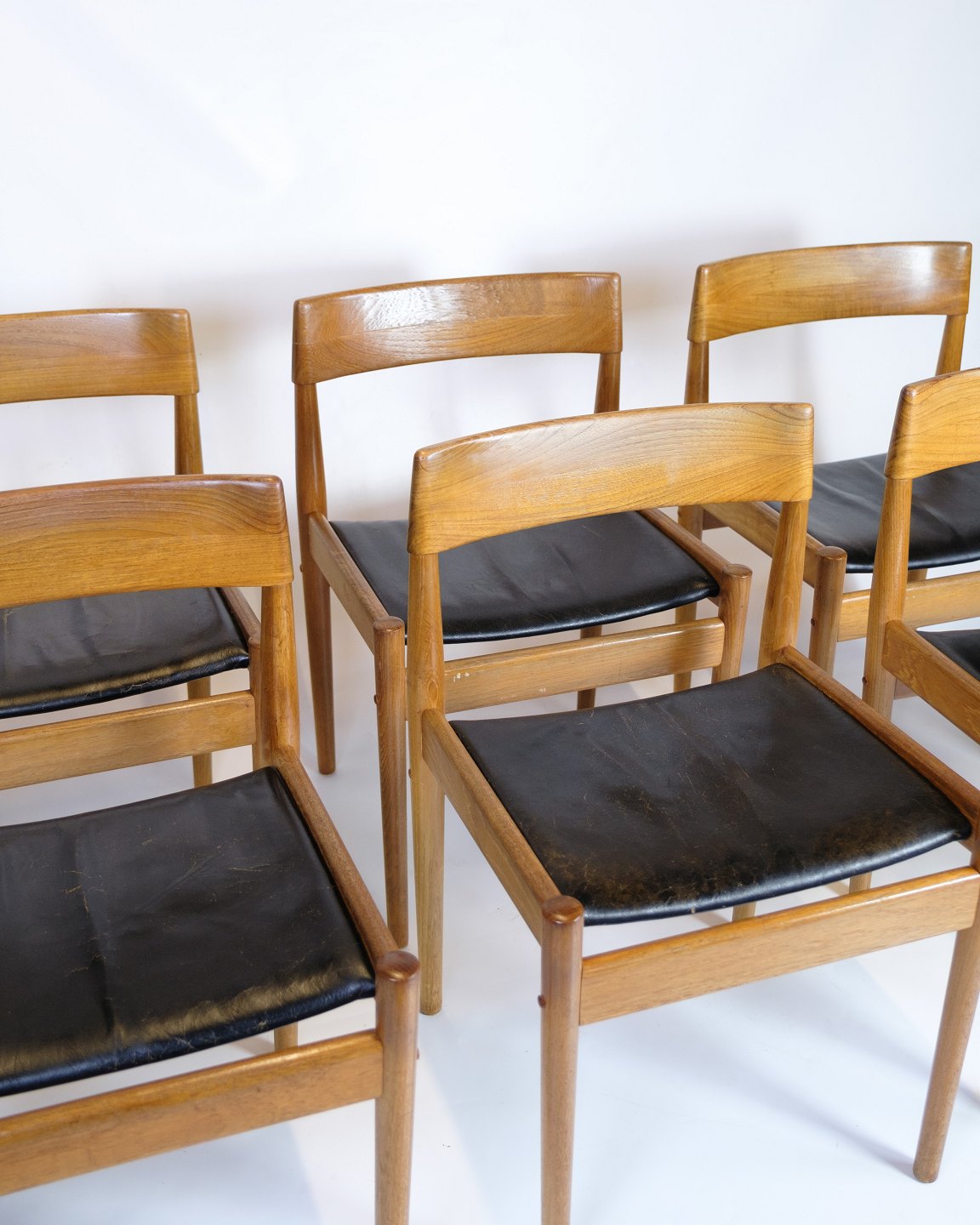 Set of six dining chairs made of teak with seats in original upholstered black leather. The chair is designed by Grete Jalk and produced by Poul Jeppesen. The chair was given the model number P J 3-2. The chairs are from the 1960s and are in great condition with age-related patina on the seats.