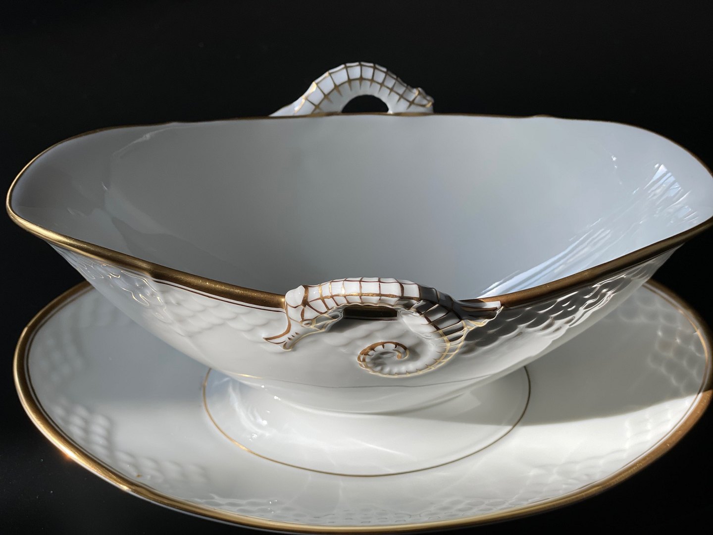Beautiful sauce bowl in white and gold decorated with seahorse. The sauce bowl is No. 8 from Bing & Grondahl's Hartmann dinner service. The B&G mark under the bowl says that it was produced between 1952 and 1957.