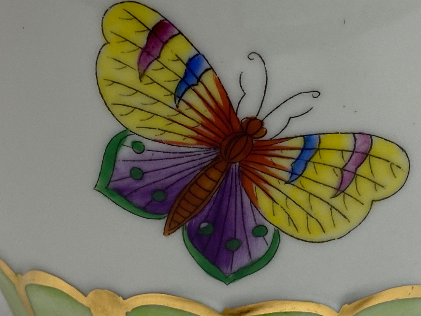 Vase from the Hungarian porcelain factory Herend with the 125th anniversary mark from 1964. Queen Victoria pattern in green and gold with multicolored flowers and butterflies.