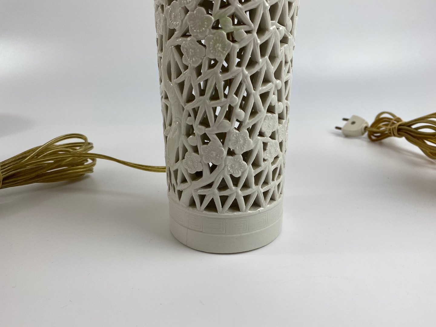 Et par smukke kinesiske / asiatiske blanc de chine søjleformede bordlamper med papirsklip-lignende gitter-mønster med blomstrende kirsebærgrene. Geometrisk mønstret bånd øverst og nederst.