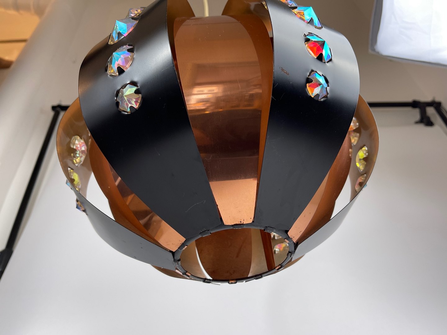 Lampe af Werner Schou for Coronell, dansk design fra midten af det 20. århundrede i kobber og sort metal med prismer