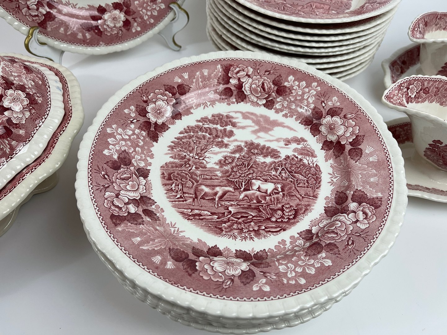 English faience dinner service from Adams, English Scenic, Staffordshire in red / pink. We have soup plates / ymer bowls, gravy boats and vegetable tureen.