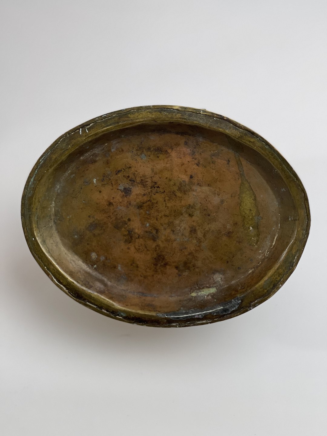 Antique brass tea box from the Middle East. Handmade chisels. Lined with pewter inside.