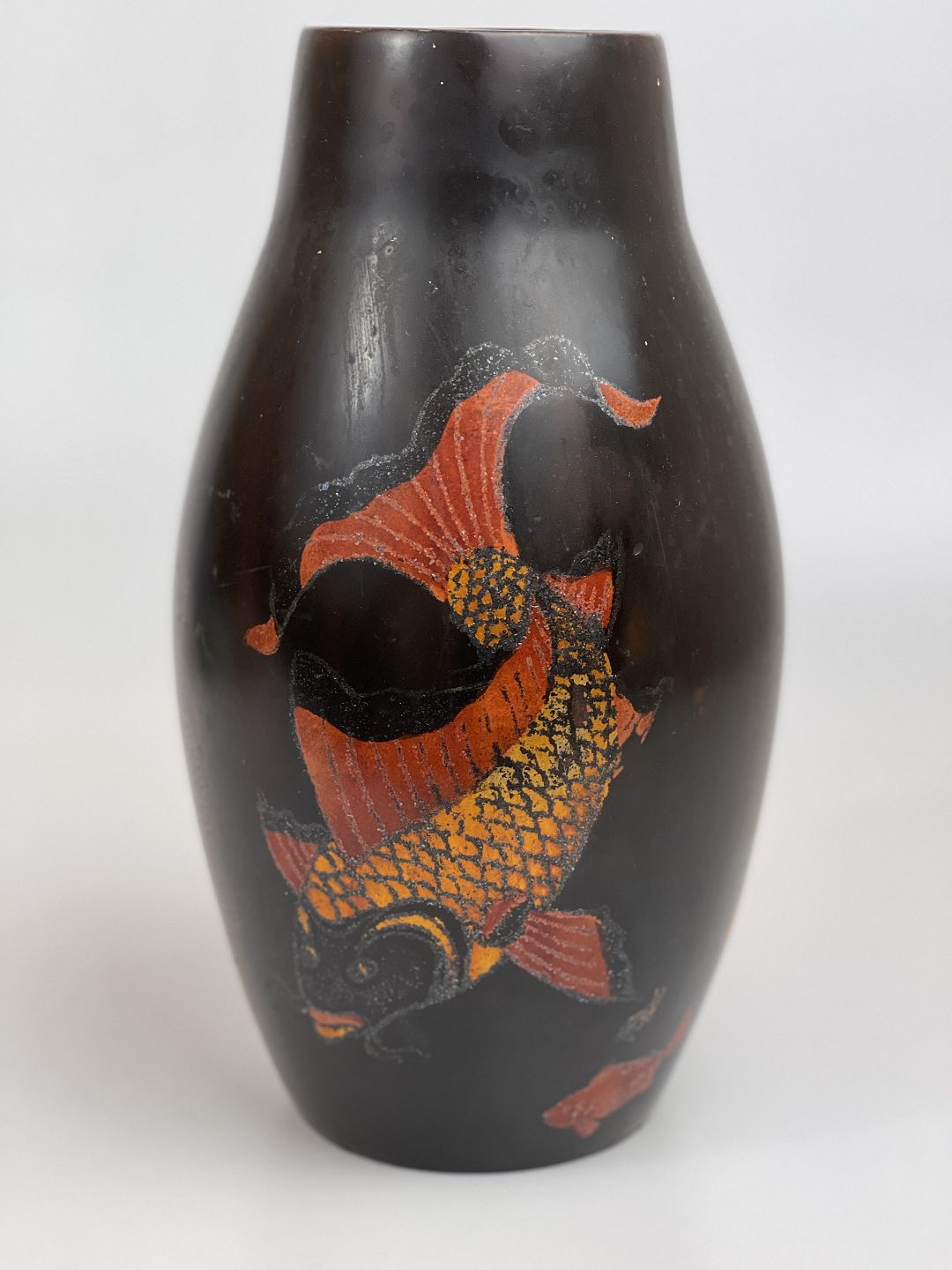 Vintage Asian lacquer vase with motif of koi fish or goldfish as well as sunrise or sunset over the sea. Japanese or maybe Vietnamese.