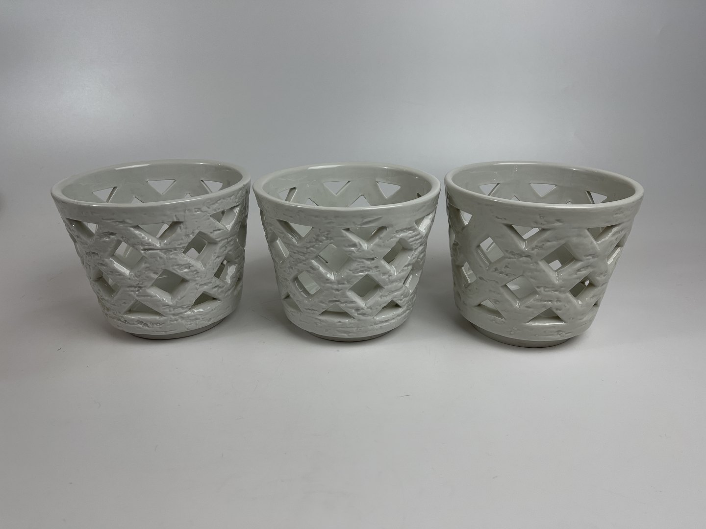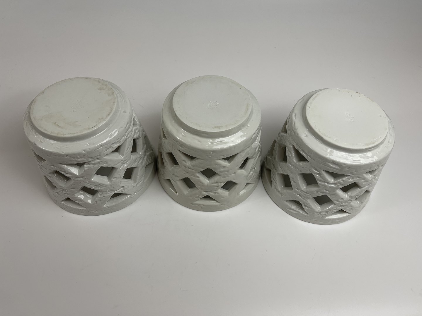 Gunnar Nylund for Rörstrand, set of three off-white chamotte flowerpots. The pots are all signed with Swedish Rorstrand's signature and with Gunnar Nylund's initials, GN.