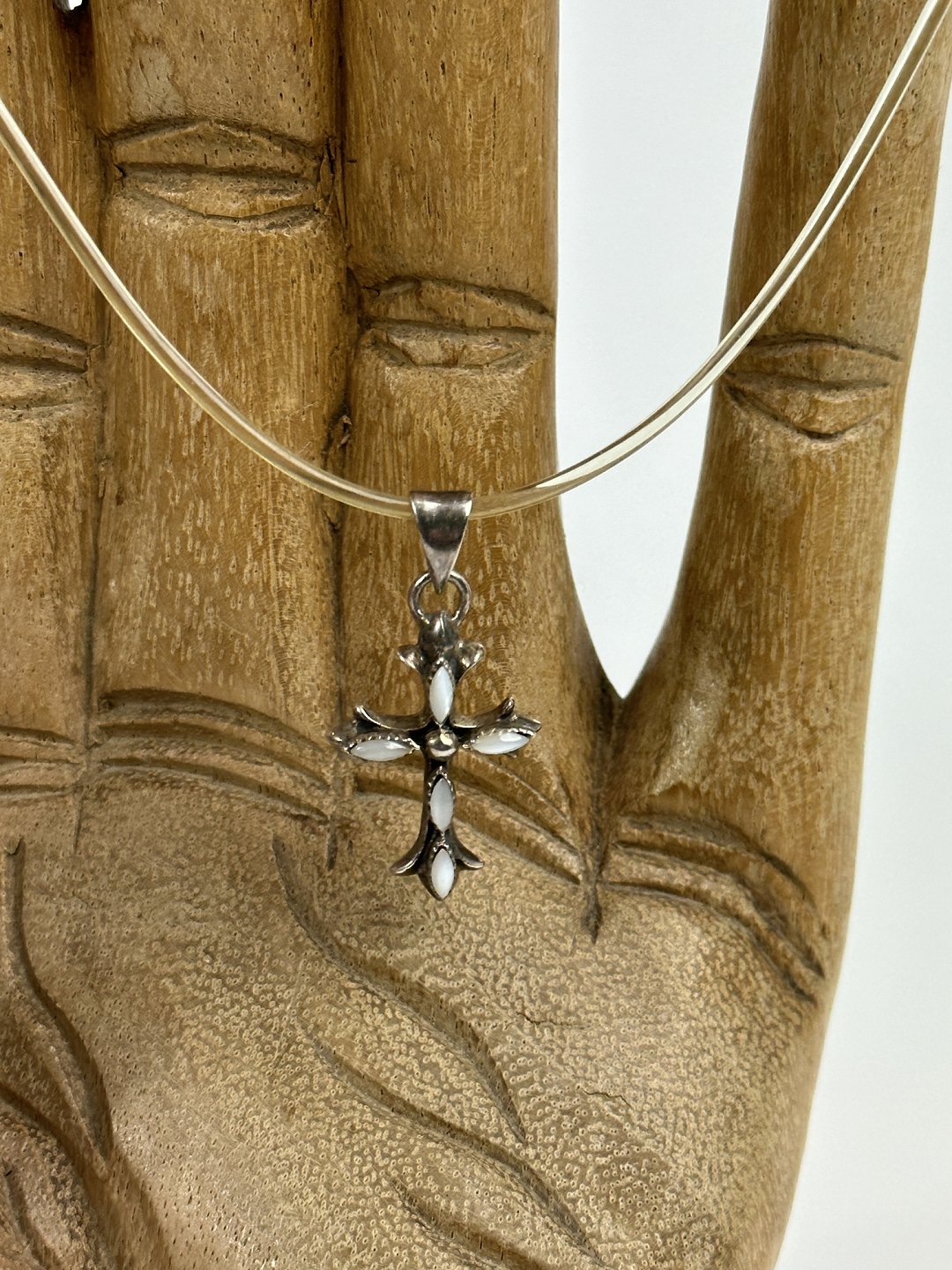 Vintage silver cross with transparent natural rubber "chain" and silver clasp. The cross measures a total of 4.20 centimeters in height. About 2 cm wide. It is stamped 925. Length of the chain is approximately 39 centimeters.