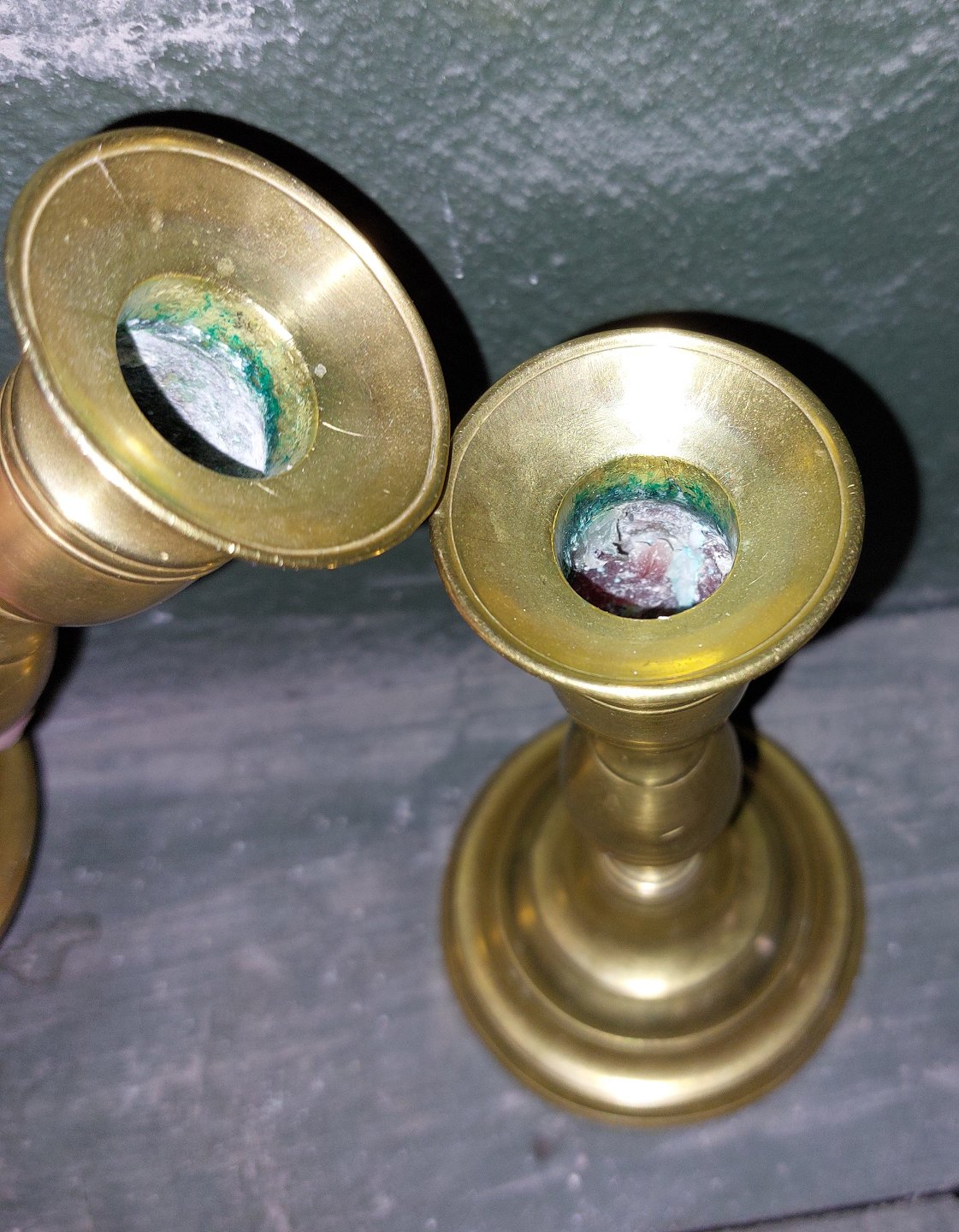 Par lysestager i messing fra omkring 1840. Begge fremstår i god stand uden skader eller reparationer. H. 16½ cm.