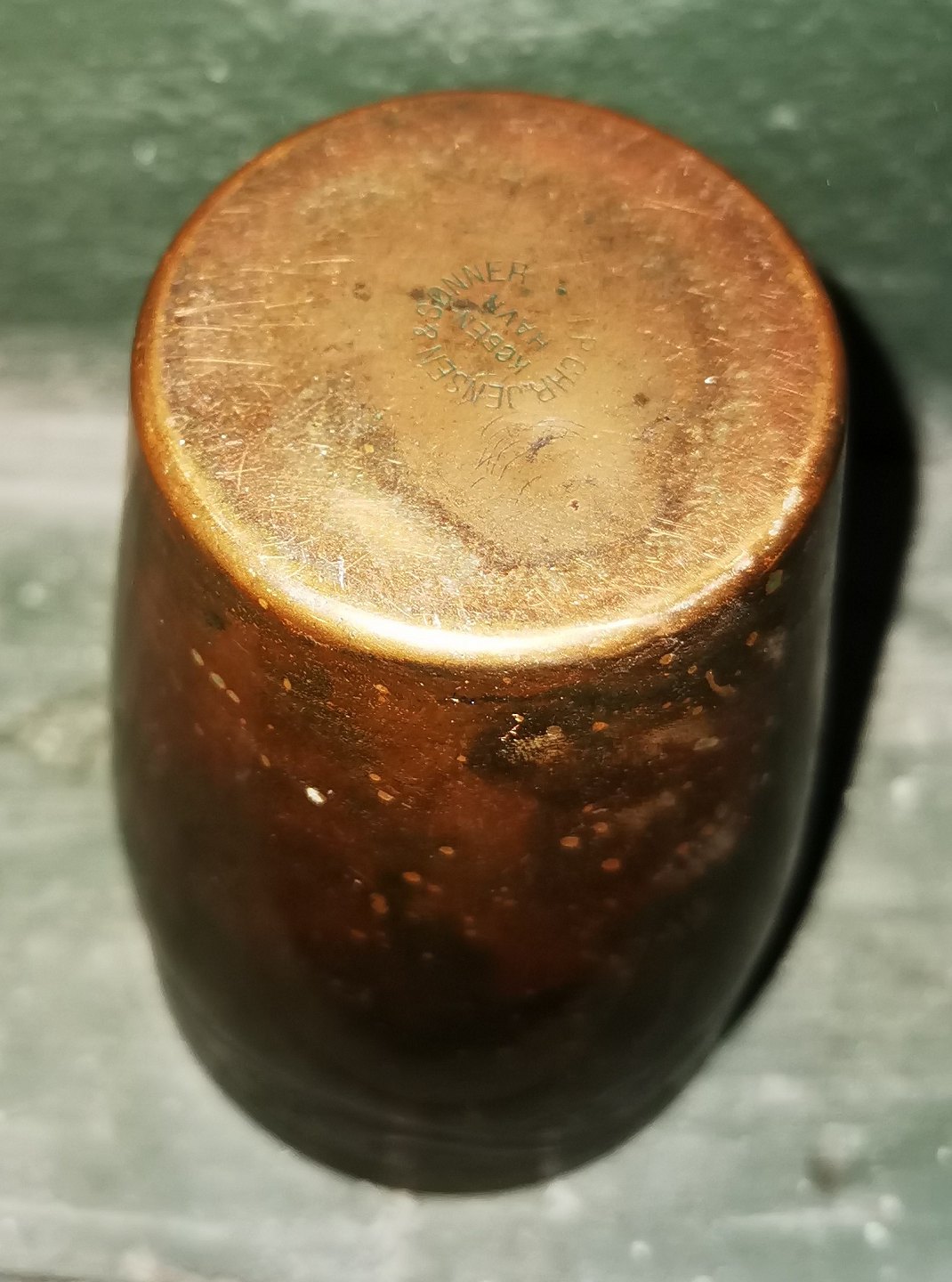 Bæger i bronce med skønvirkedekorationer. Fremstillet hos Chr. Jensen & Sønner i København i begyndelsen af 20. århundrede. Fremstår i god stand uden skader eller reparationer. Mål: H. 12 cm Ø. 8½ cm.