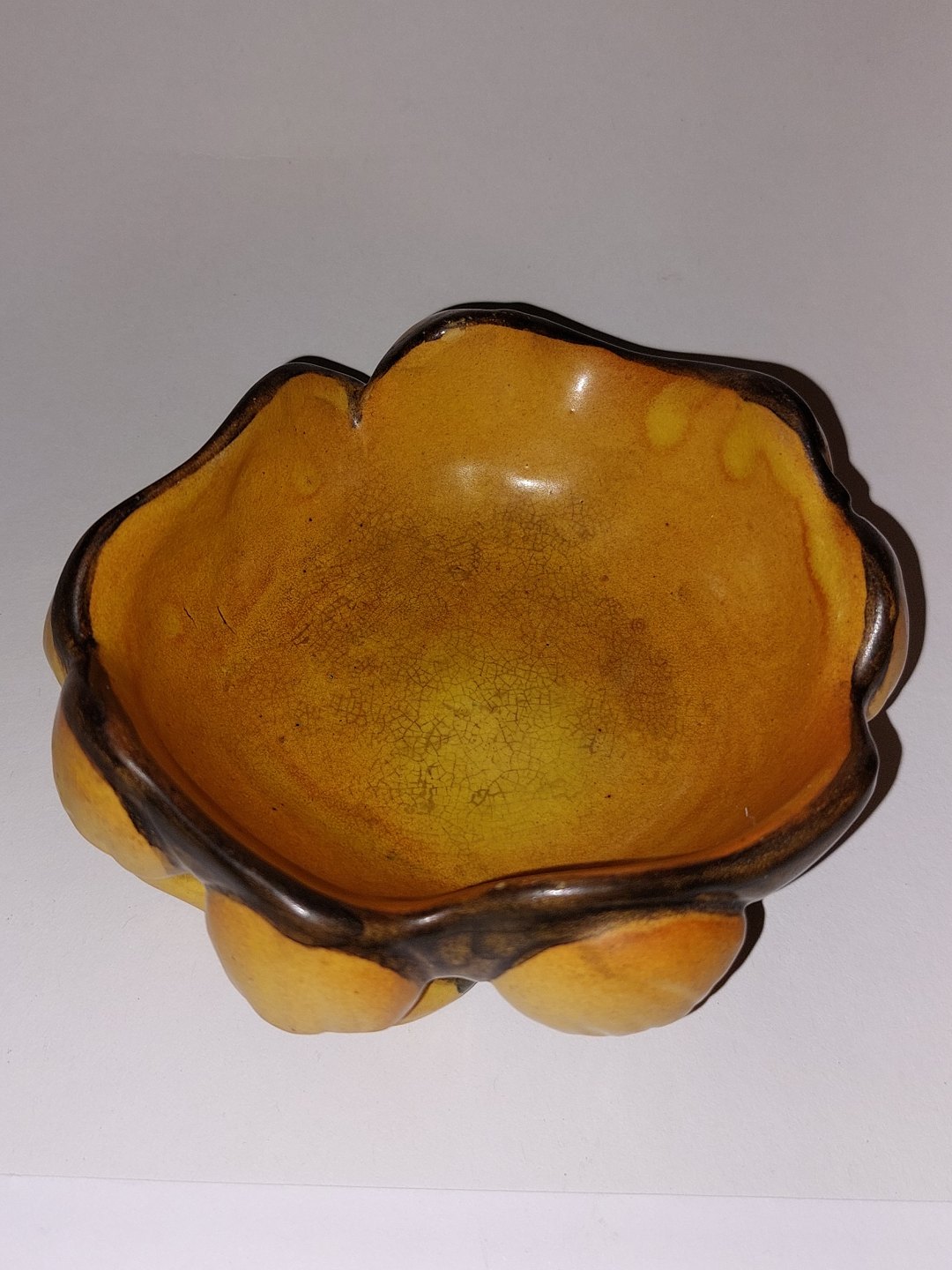 Danish Skønvirke (Art Nouveau): Bowl in ceramics from the Copenhagen pottery factory Peter Ipsen. Made in the early 20th century. Modeled decoration of mushrooms in relief around the bowl. In good condition. Slight traces of wear inside. The factory mark on the bottom. Dimensions: 4 cm high and 11 cm in diameter.