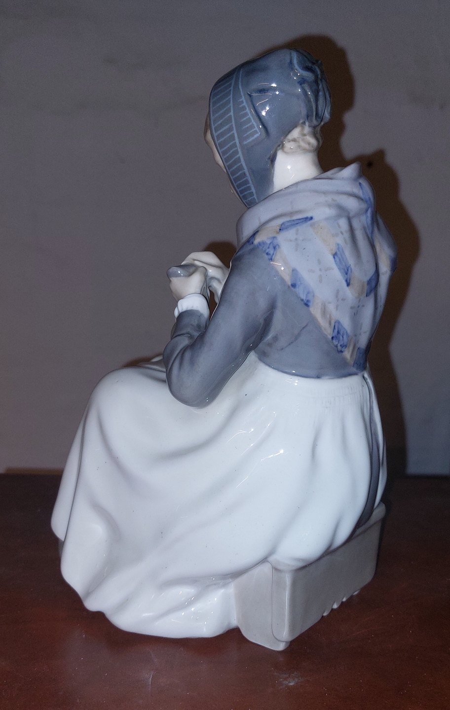 Royal Copenhagen figure in porcelain of young woman in regional costume knitting. Model number 1317. In good condition without damage or repairs. Factory first production. H. 22½ cm (8.85 inches).