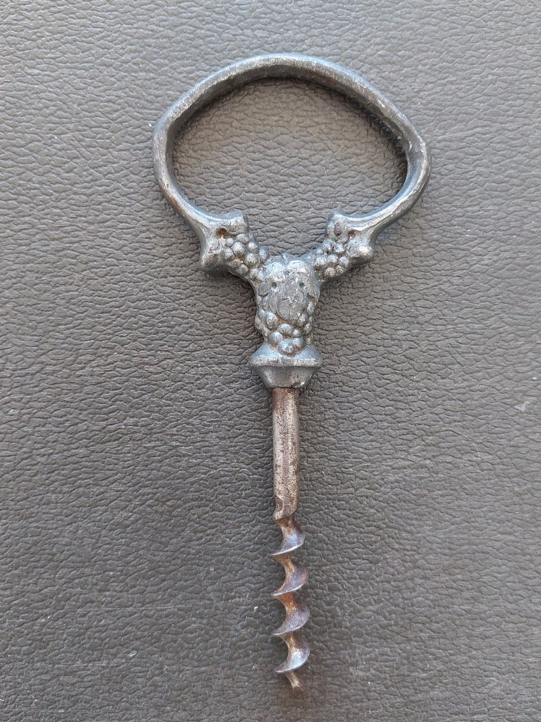 Proptrækker i tin fra omkring 1920. Dekoreret med vindruer. I god stand. L. 14 cm