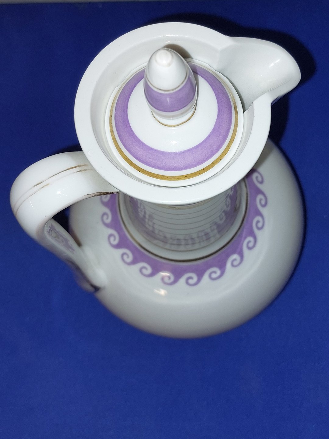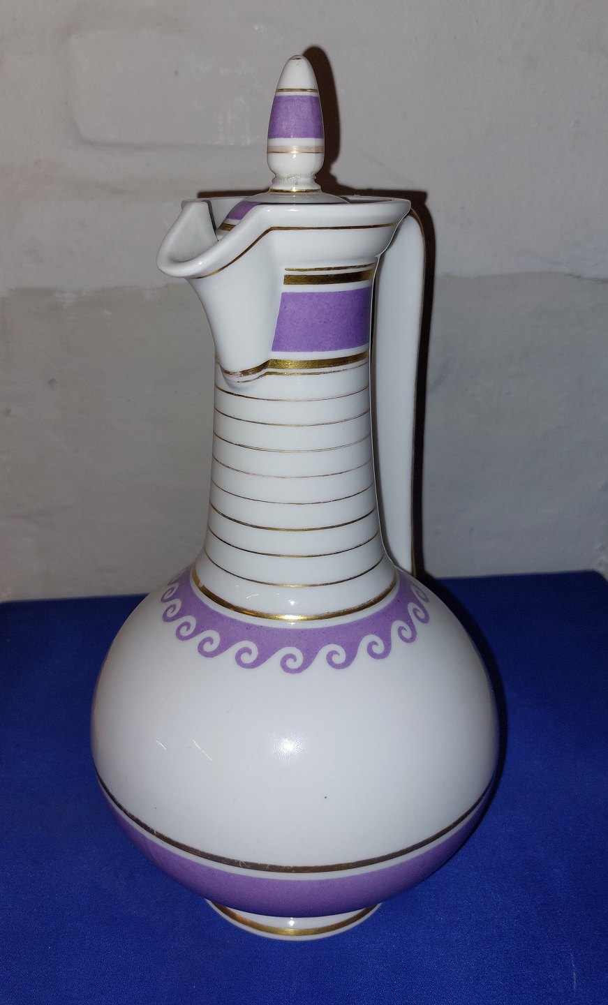 Royal Copenhagen kande I porcelæn med tilhørende låg. Lilla og hvid. Skår på låget og indvendigt ved åbningen. Ellers i god stand. Fabriksmærket på bunden. H. 28 cm