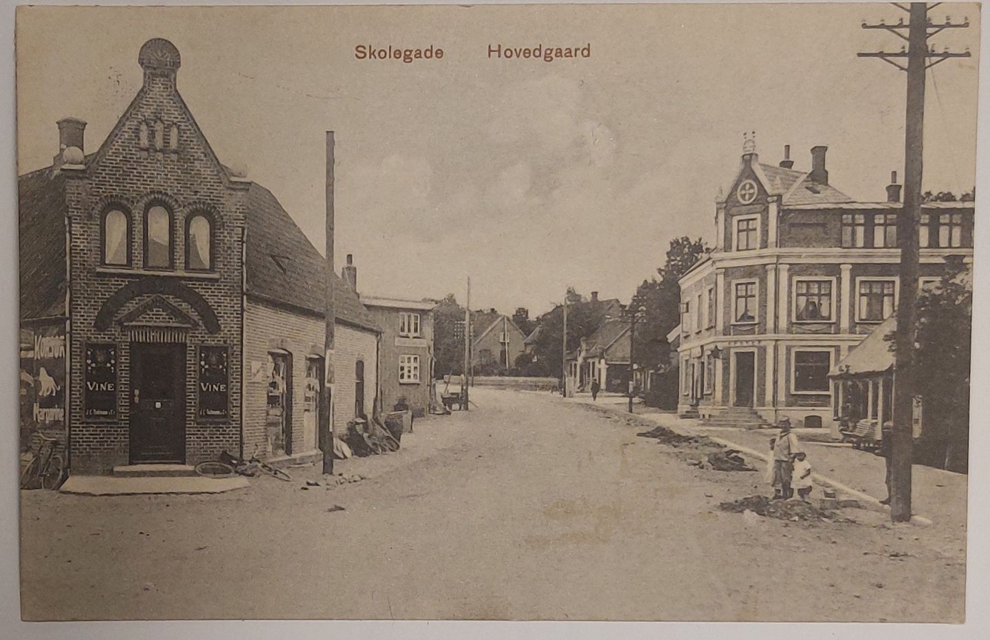 Hovedgaard: Skolegade med butiksfacade. Annulleret HOVEDGAARD i 1912. I god stand.