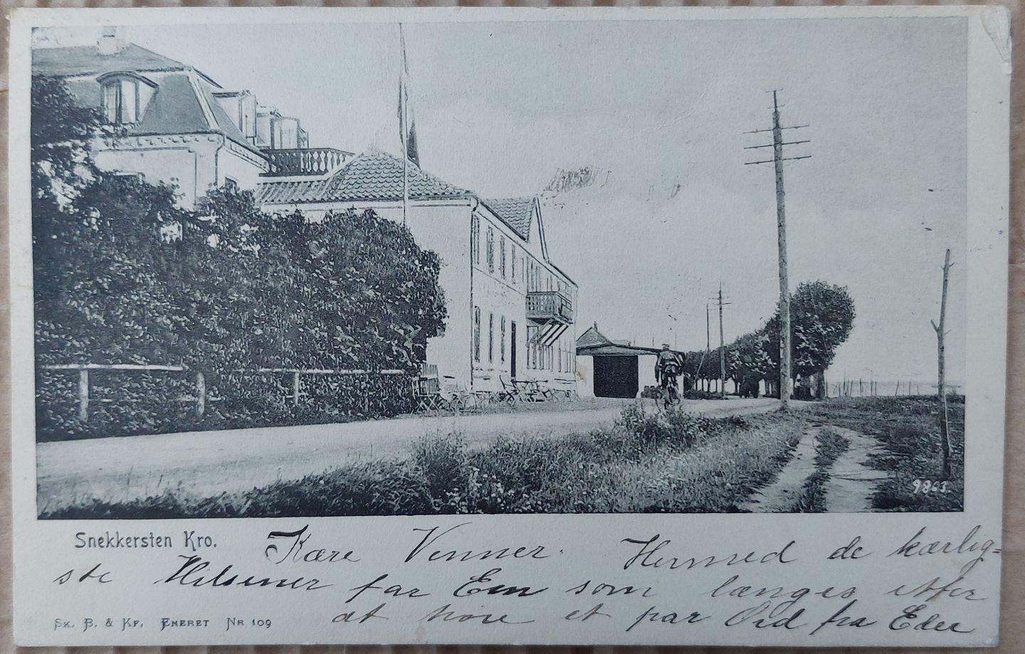Postkort: Motiv fra Snekkersten Kro. Annulleret med Stjernestempel NØRAGER i 1906. I god stand